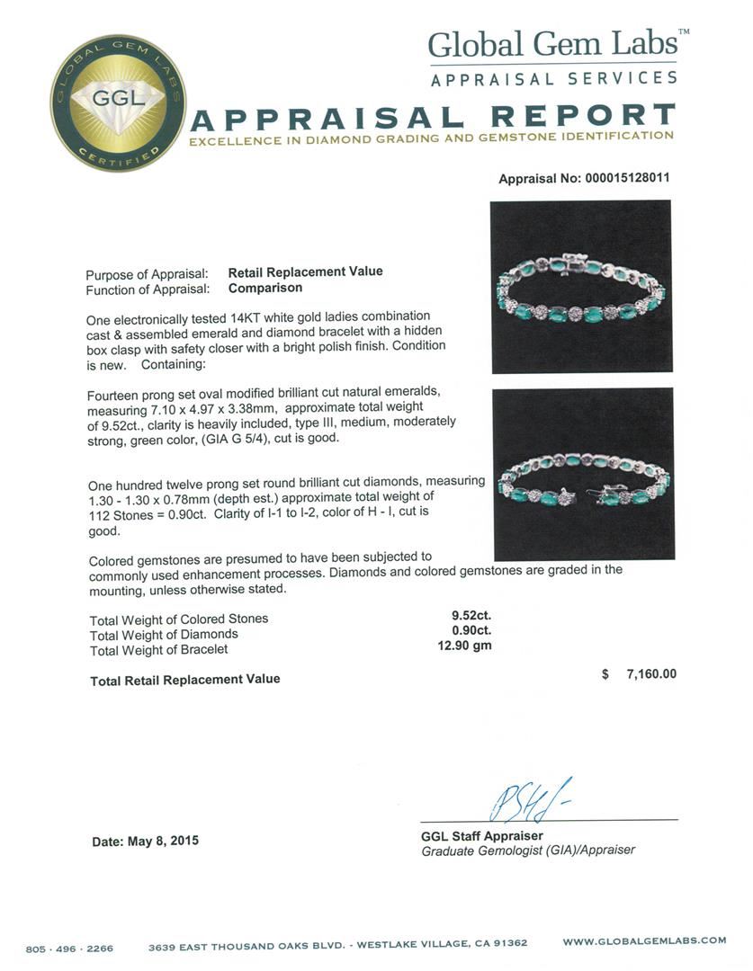 One electronically tested 14KT white gold ladies combination cast & assembled emerald and diamond bracelet with a hidden box clasp with safety closer with a bright polish finish. Condition is new. Containing: Fourteen prong set oval modified brilliant cut GGL Appraised at $7,160.00.