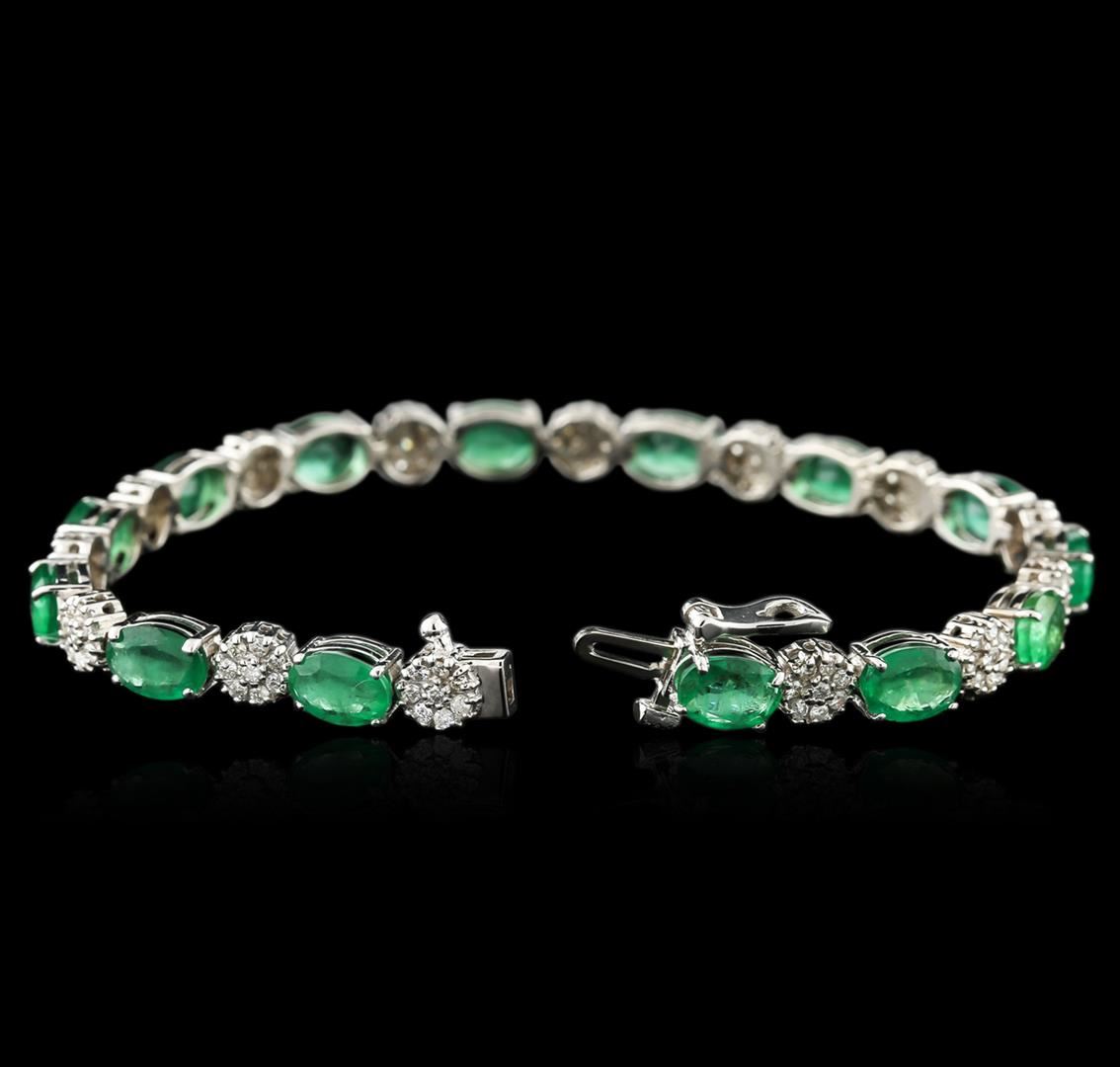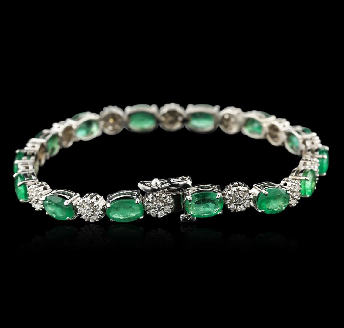 One electronically tested 14KT white gold ladies combination cast & assembled emerald and diamond bracelet with a hidden box clasp with safety closer with a bright polish finish. Condition is new. Containing: Fourteen prong set oval modified brilliant cut natural emeralds, measuring 7.10 x 4.97 x 3.38mm, approximate total weight of 9.52ct., clarity is heavily included, type III, medium, moderately strong, green color, (GIA G 5/4), cut is good. One Hundred Twelve prong set round brilliant cut diamonds, measuring 1.30 - 1.30 x 0.78mm (depth est.) approximate total weight of 112 Stones = 0.90ct. Clarity: I-1 to I-2. Color: H - I, Cut is Good. Colored gemstones are presumed to have been subjected to commonly used enhancement processes. Diamonds and colored gemstones are graded in the mounting, unless otherwise stated. Total Weight of Colored Stones 9.52ct. Total Weight of Diamonds 0.90ct. Total Weight of Bracelet 12.90 grams. GGL Appraised at $7,160.00.