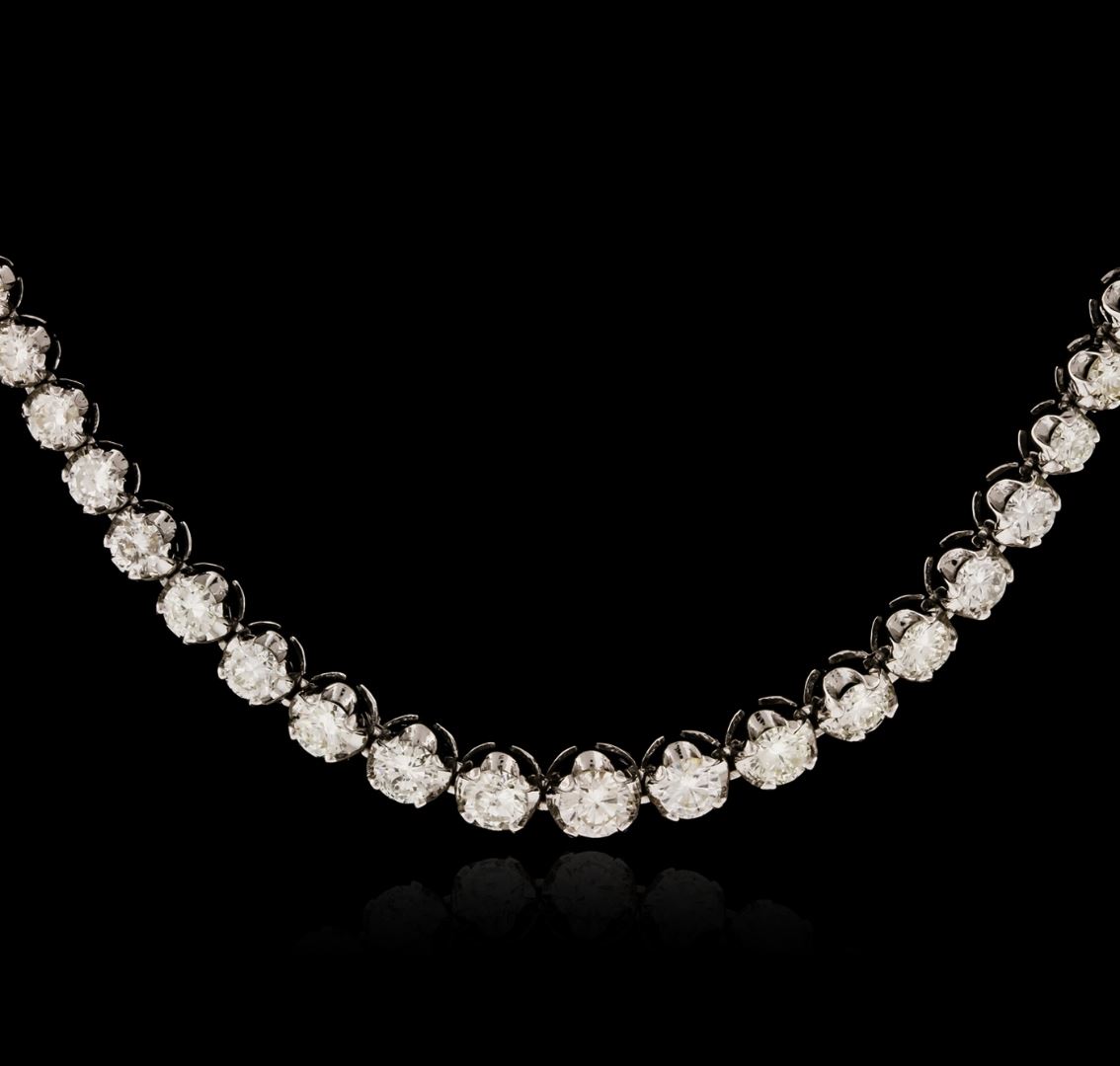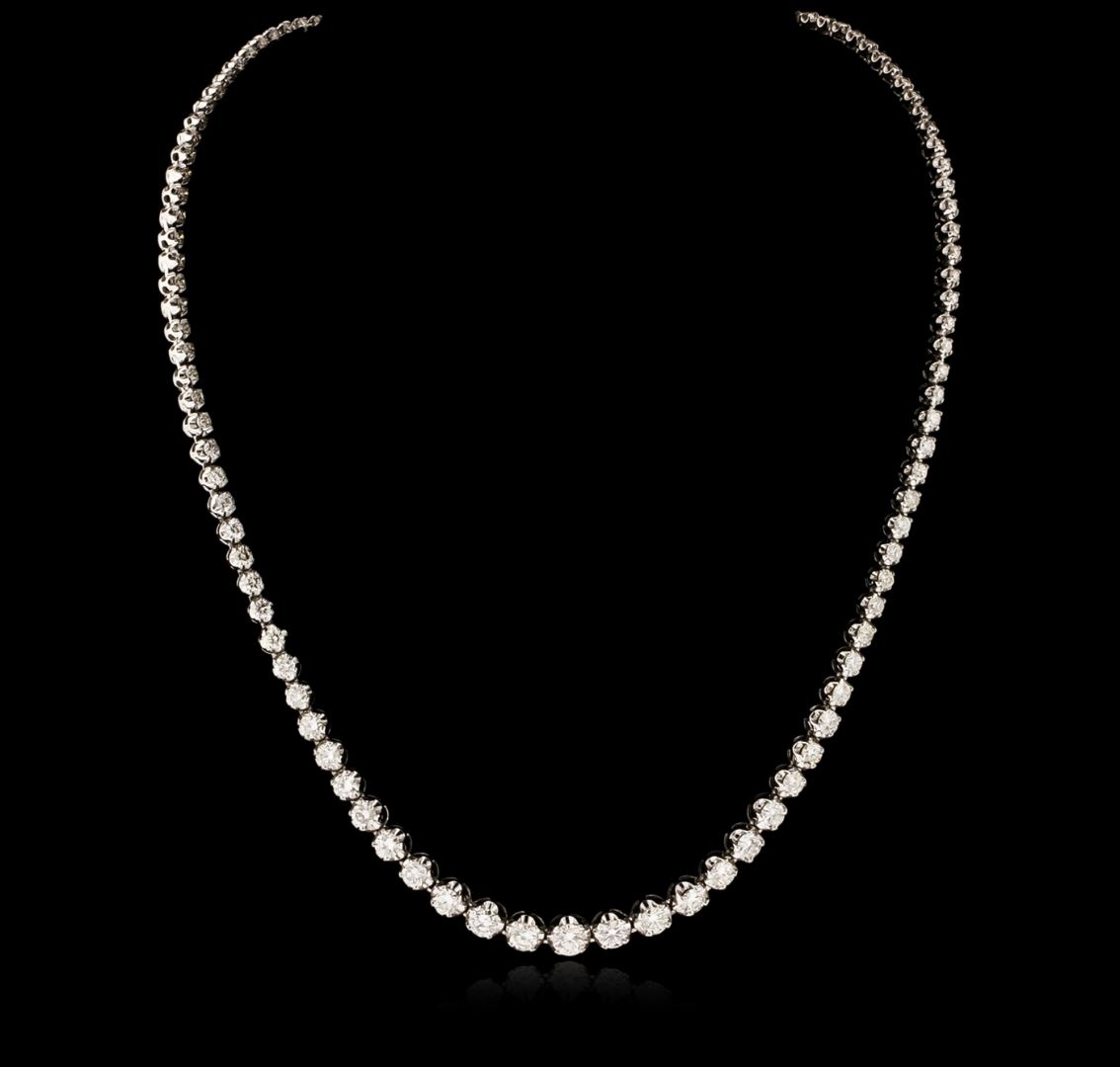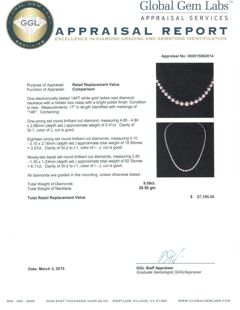 One electronically tested 14KT white gold ladies cast diamond necklace with a hidden box clasp with a bright polish finish. Measurements: 17" in length Identified with markings of "14K". Condition is new. Containing: One prong set round brilliant cut diamond, measuring 4.80 - 4.80 x 2.88mm (depth est.) approximate weight of 0.41ct. Clarity: SI-1. Color: J, Cut is Good. Eighteen prong set round brilliant cut diamonds, measuring 4.10 - 3.10 x 2.16mm (depth est.) approximate total weight of 18 Stones = 3.07ct. Clarity: SI-2 to I-1. Color: I - J, Cut is Good. Ninety-Two bezel set round brilliant cut diamonds, measuring 2.80 - 1.30 x 1.23mm (depth est.) approximate total weight of 92 Stones = 6.11ct. Clarity: SI-2 to I-1. Color: I - J, Cut is Good. All diamonds are graded in the mounting, unless otherwise stated. Total Weight of Diamonds 9.59ct. Total Weight of Necklace 26.50 grams. GGL Appraised at $27,195.00.
