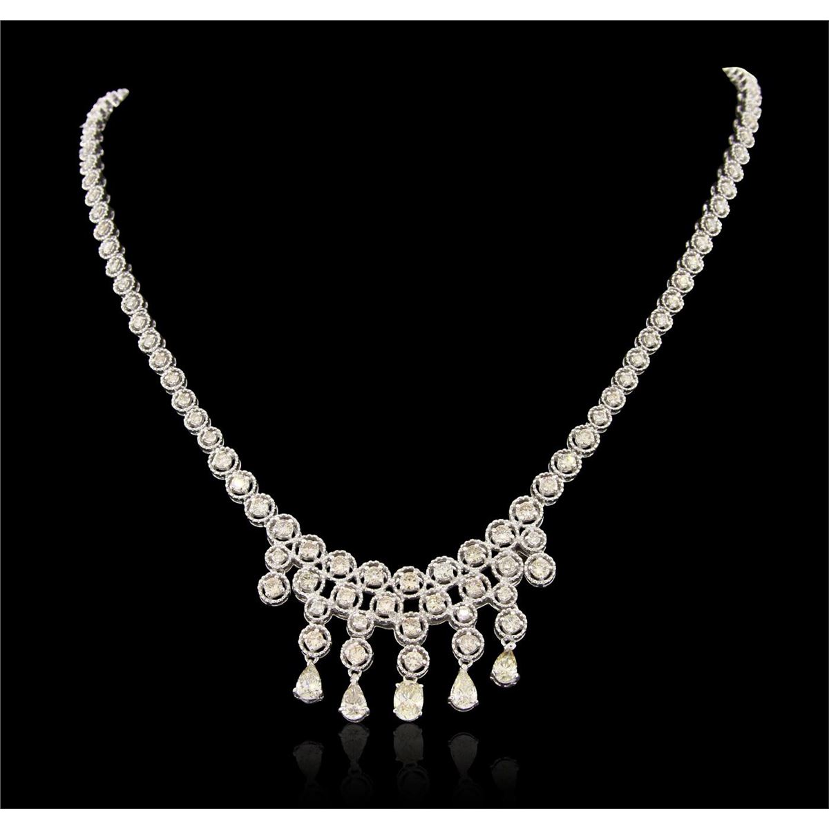 One electronically tested 14KT white gold ladies cast & assembled diamond drape motif necklace with a bright polish with milgrain finish. Condition is good. Eighteen inch length necklace features a drape motif diamond ornament supported by a matching ribbon of graduating ribbon of diamonds terminating in a concealed clasp with safety. Identified with markings of "K14". Containing: One oval shaped cut diamond, measuring 6.40 x 4.60 x 3.10mm (depth est.) approximate weight of 0.63ct. Faint brown secondary color throughout. Graded in the setting. Clarity SI-1. Color Very Light Brown. Four prong set pear shaped cut diamonds, measuring 6.40 x 4.00 x 2.52mm (depth est.) approximate total weight of 4 Stones = 1.63ct. Measurements & the color grade are an average for the group. Faint brown secondary color throughout. Graded in the setting. Clarity VS-2 to SI-2. Color Very Light Brown. One hundred fifteen prong set round brilliant cut diamonds, measuring 3.10 - 2.10 x 1.56mm (depth est.) approximate total weight of 115 Stones = 7.49ct. Faint brown secondary color throughout. Color grade is an average for the group. Graded in the setting. Clarity SI-1 to I-1. Color M. Total Weight of Diamonds 9.75ct. Total Weight of Necklace 41.90gm. AIG Appraised at $32,085.00.