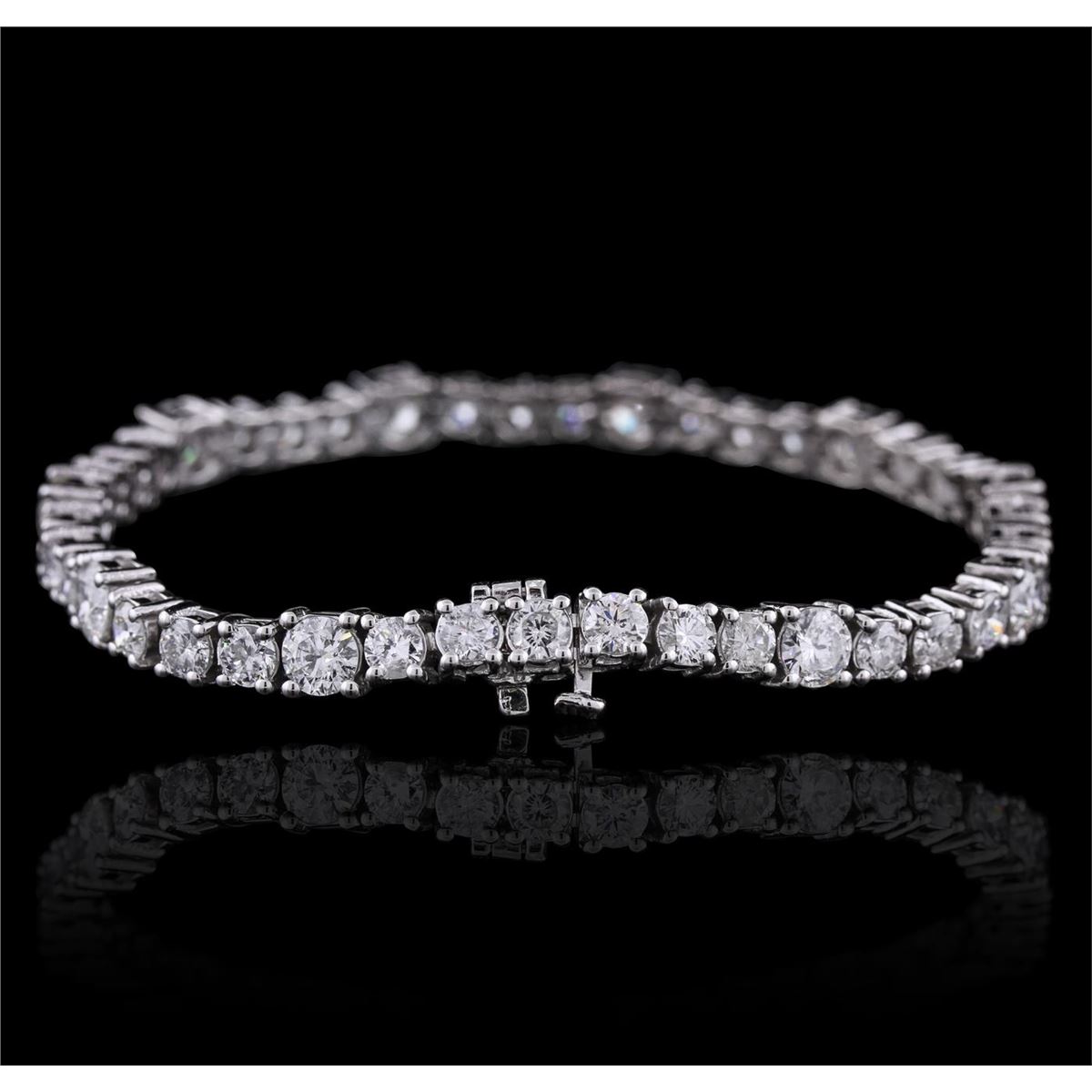 One electronically tested 14KT white gold ladies combination cast & assembled tennis bracelet with a hidden box clasp with a bright polish finish. Condition is new. Measurements: 7" in length. Identified with markings of "14K". Containing: Thirty-Three prong set round brilliant cut diamonds, measuring 3.50 - 3.50 x 2.10mm (depth est.) approximate. Total Weight of 33 Stones = 5.18ct. Clarity: SI-2 to I-1. Color: F - H, Cut is Good. Ten prong set round brilliant cut diamonds, measuring 5.00 - 5.00 x 3.00mm (depth est.) approximate. Total Weight of 10 Stones = 4.58ct. Clarity: SI-2 to I-1. Color: G - H, Cut is Good. All diamonds are graded in the mounting, unless otherwise stated. Total Weight of Diamonds 9.75ct. Total Weight of Bracelet 17.70 grams. GGL Appraised at $47,165.00.