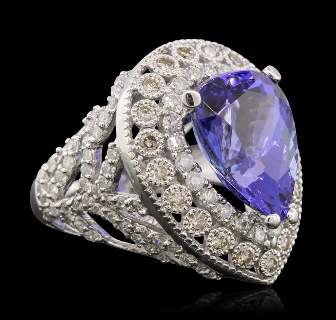 One electronically tested 14KT white gold cast tanzanite & diamond ring with a bright & patterned finish. The featured tanzanite is set within an elaborate multi-tiered diamond bezel, supported by diamond set tapering shoulders, completed by a three millimeter wide band. Identified with markings of "14K". Condition is new, good workmanship. Containing: One prong set pear mixed cut natural tanzanite, measuring 14.00. x 12.00. x 7.90mm, 10%. bulge factor, approximate weight of 9.78ct., clarity is eye clean, type I, dark, moderately strong, violetish blue color, (GIA vB 7/4), cut is good. Transmitting light with no distortion, transparent. Colored Stone Grading Report attached. Graded in the setting. Tanzanite is a very rare gemstone that is only found in the country of Tanzania. Originally discovered in 1967. Tiffany & Company, named the stone Tanzanite. It is found in the Usumburu Mountains that border the Umba Valley of northern Tanzania. Tanzanite occurs in gray, brown, violet, blue, reddish-purple, & green. The gem is interesting because of its exceptional pleochroism. Rotated in different directions a tanzanite will exhibit multiple changes of color. Tanzanite has a low tolerance to ultrasonic cleaning, and should not be cleaned using this method. Twenty bezel set round brilliant cut diamonds, measuring 1.90 - 1.90 x 1.14mm (depth est.) approximate total weight of 20 Stones = 0.50ct. Graded in the setting. Clarity: SI-1 to SI-2 One Hundred Twenty prong set round brilliant cut diamonds, measuring 1.90 - 1.35 x 0.98mm (depth est.) approximate total weight of 120 Stones = 1.70ct. Graded in the setting. Clarity: SI-2 to I-2 . Color: G - I. Total Weight of Colored Stones 9.78ct. Total Weight of Diamonds 2.20ct. Total Weight of Ring 10.20 grams. AIG Appraised at $7,540.00.