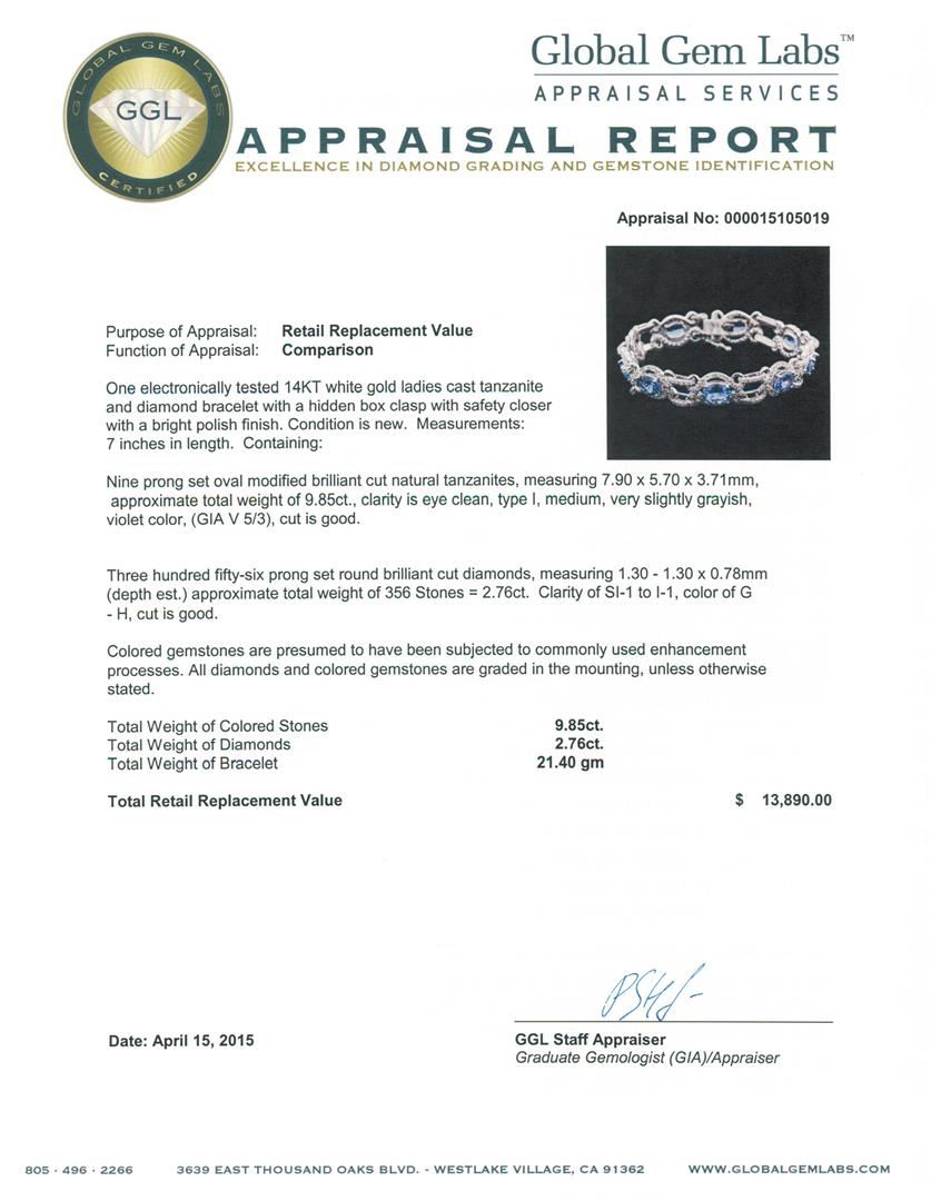 One electronically tested 14KT white gold ladies cast tanzanite and diamond bracelet with a hidden box clasp with safety closer with a bright polish finish. Measurements: 7 inches in length. Condition is new. Containing: Nine prong set oval modified brilliant cut natural tanzanites, measuring 7.90 x 5.70 x 3.71mm, approximate total weight of 9.85ct., clarity is eye clean, type I, medium, very slightly grayish, violet color, (GIA V 5/3), cut is good. Three Hundred Fifty-Six prong set round brilliant cut diamonds, measuring 1.30 - 1.30 x 0.78mm (depth est.) approximate total weight of 356 Stones = 2.76ct. Clarity: SI-1 to I-1. Color: G - H, Cut is Good. Colored gemstones are presumed to have been subjected to commonly used enhancement processes. All diamonds and colored gemstones are graded in the mounting, unless otherwise stated. Total Weight of Colored Stones 9.85ct. Total Weight of Diamonds 2.76ct. Total Weight of Bracelet 21.40 grams. GGL Appraised at $13,890.00.