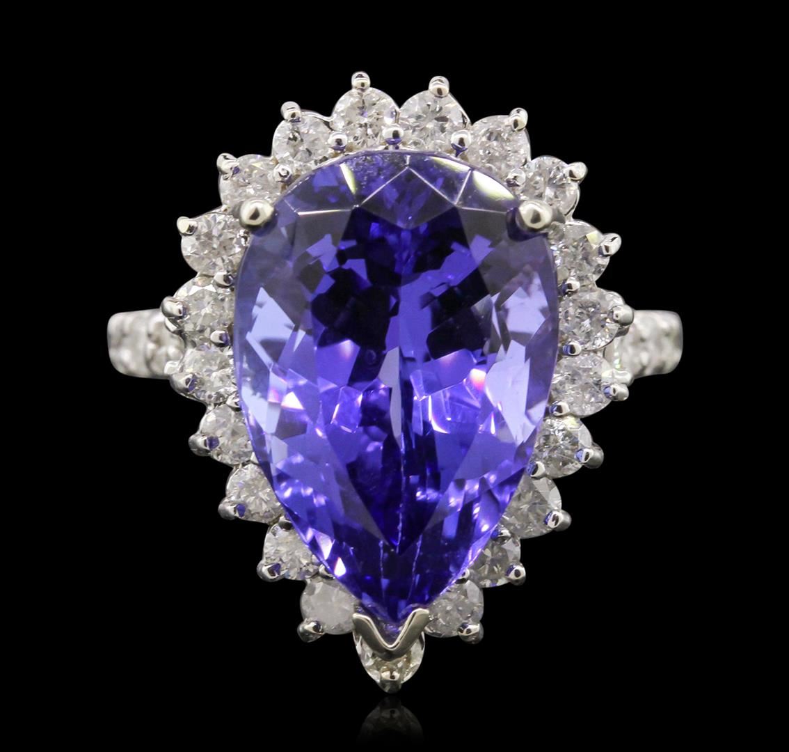 One electronically tested 14KT white gold Ladies combination cast & assembled ring with a high polish finish. Condition is new. Identified with markings of "14K". Containing: Thirty-Five prong set round brilliant cut diamonds, measuring 2.00 - 2.00 x 1.20mm (depth est.) approximate. Total Weight of 35 Stones = 1.22ct. Clarity: I-1 to I-3. Color: H - I, Cut is Good. One prong set pear modified brilliant cut natural tanzanite, measuring 15.75 x 10.80 x 8.59mm, exact weight 9.90ct., clarity is eye clean, type I, medium, moderately strong, violet color, (GIA V 5/4), cut is very good. GIA Report: 2151964588.Total Weight of Colored Stones 9.90ct. Total Weight of Diamonds 1.22ct. Total Weight of Ring 6.40 grams. GGL Appraised at $16,815.00.
