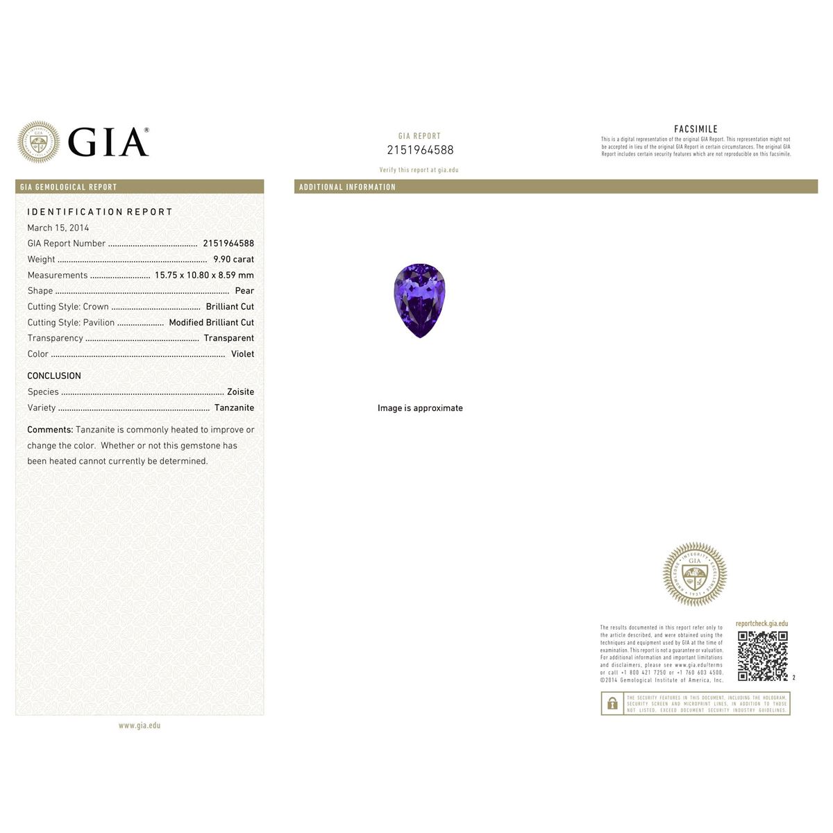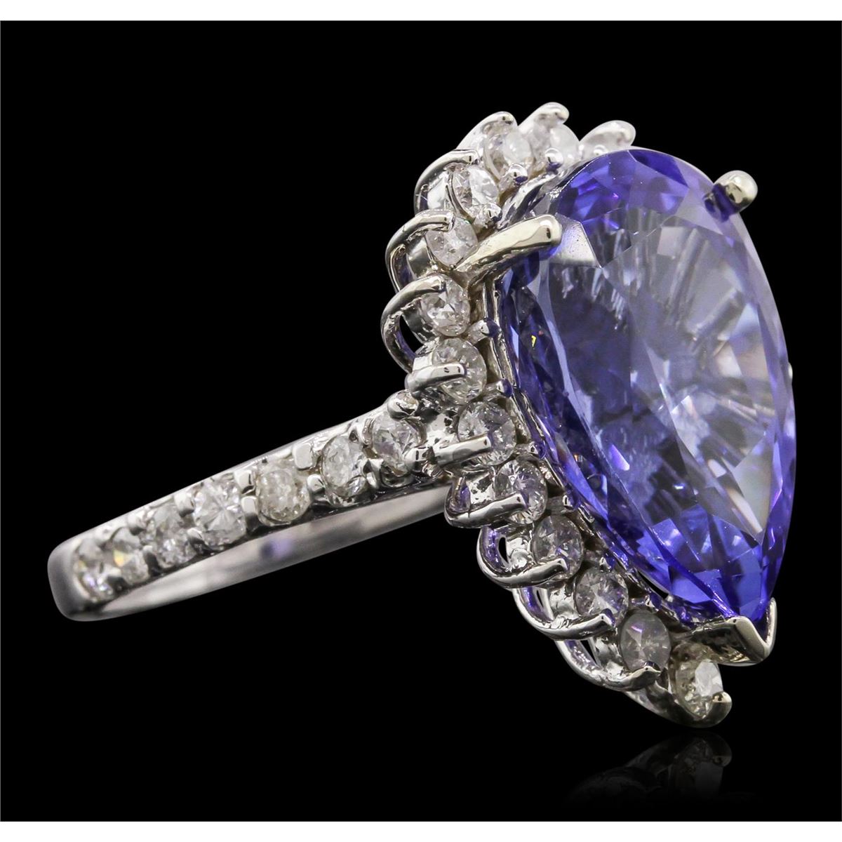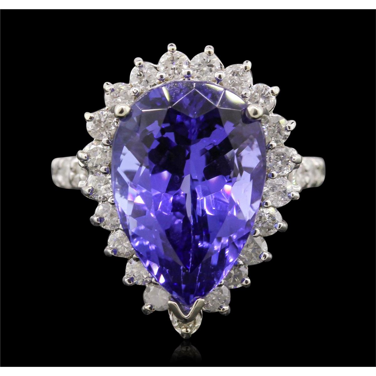 One electronically tested 14KT white gold Ladies combination cast & assembled ring with a high polish finish. Condition is new. Identified with markings of "14K". Containing: Thirty-Five prong set round brilliant cut diamonds, measuring 2.00 - 2.00 x 1.20mm (depth est.) approximate. Total Weight of 35 Stones = 1.22ct. Clarity: I-1 to I-3. Color: H - I, Cut is Good. One prong set pear modified brilliant cut natural tanzanite, measuring 15.75 x 10.80 x 8.59mm, exact weight 9.90ct., clarity is eye clean, type I, medium, moderately strong, violet color, (GIA V 5/4), cut is very good. GIA Report: 2151964588.Total Weight of Colored Stones 9.90ct. Total Weight of Diamonds 1.22ct. Total Weight of Ring 6.40 grams. GGL Appraised at $16,815.00.