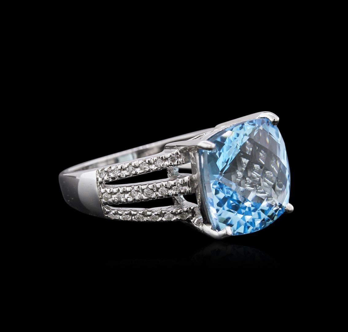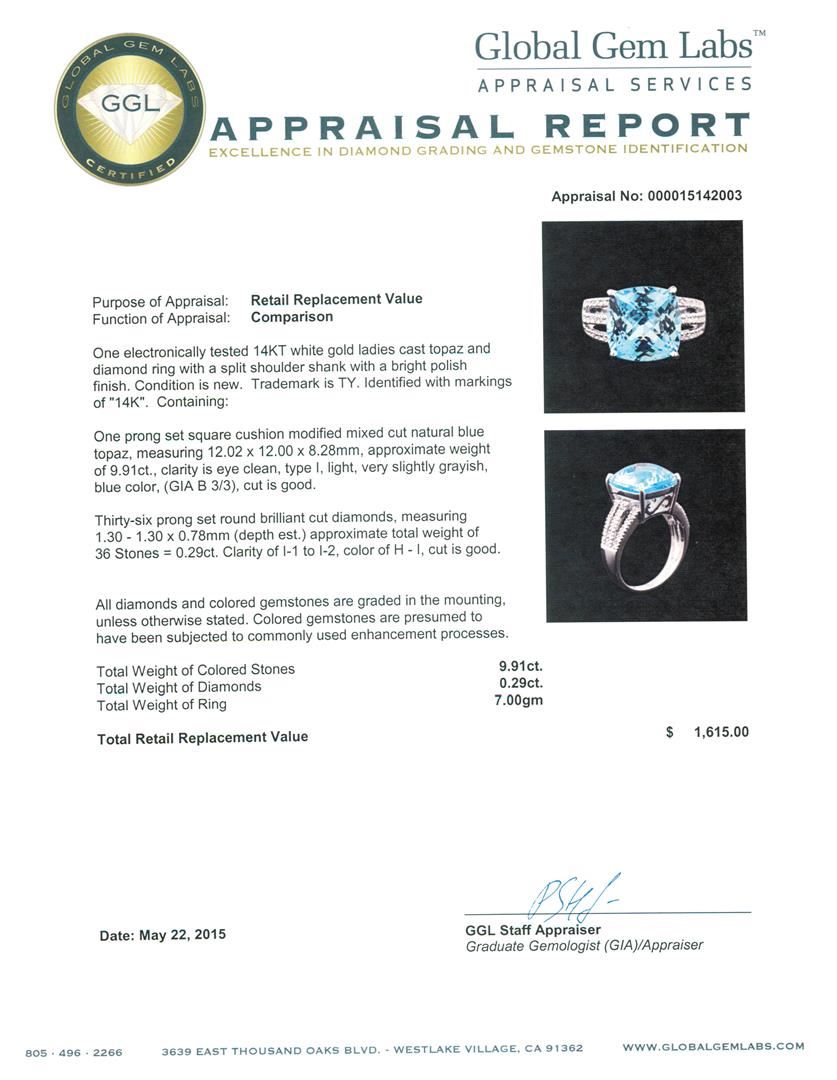 One electronically tested 14KT white gold ladies cast topaz and diamond ring with a split shoulder shank with a bright polish finish. Trademark is TY. Identified with markings of "14K". Condition is new. Containing: One prong set square cushion modified mixed cut natural blue topaz, measuring 12.02 x 12.00 x 8.28mm, approximate weight of 9.91ct., clarity is eye clean, type I, light, very slightly grayish, blue color, (GIA B 3/3), cut is good. Thirty-Six prong set round brilliant cut diamonds, measuring 1.30 - 1.30 x 0.78mm (depth est.) approximate total weight of 36 Stones = 0.29ct. Clarity: I-1 to I-2. Color: H - I, Cut is Good. All diamonds and colored gemstones are graded in the mounting, unless otherwise stated. Colored gemstones are presumed to have been subjected to commonly used enhancement processes. Total Weight of Colored Stones 9.91ct. Total Weight of Diamonds 0.29ct. Total Weight of Ring 7.00 grams. GGL Appraised at $1,615.00.