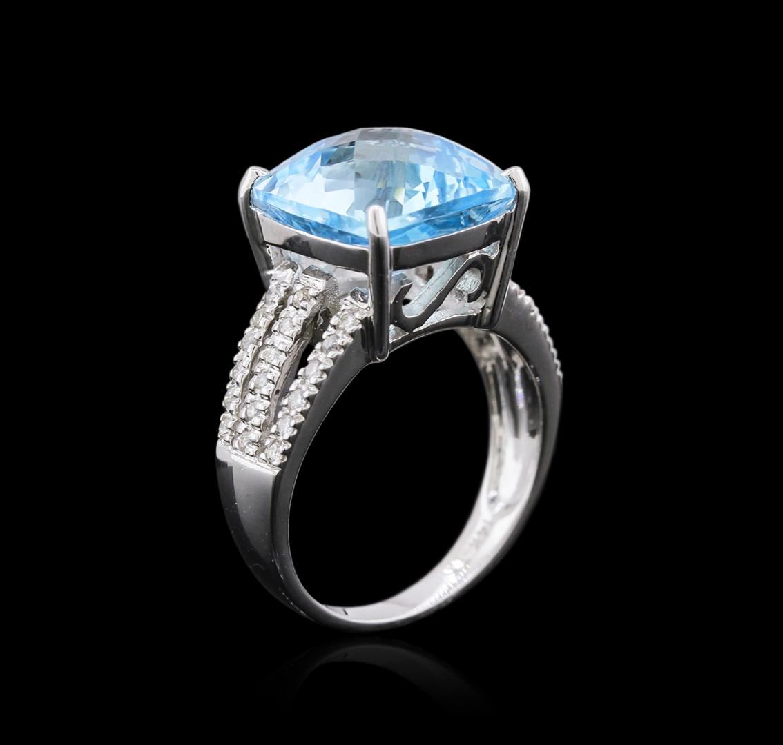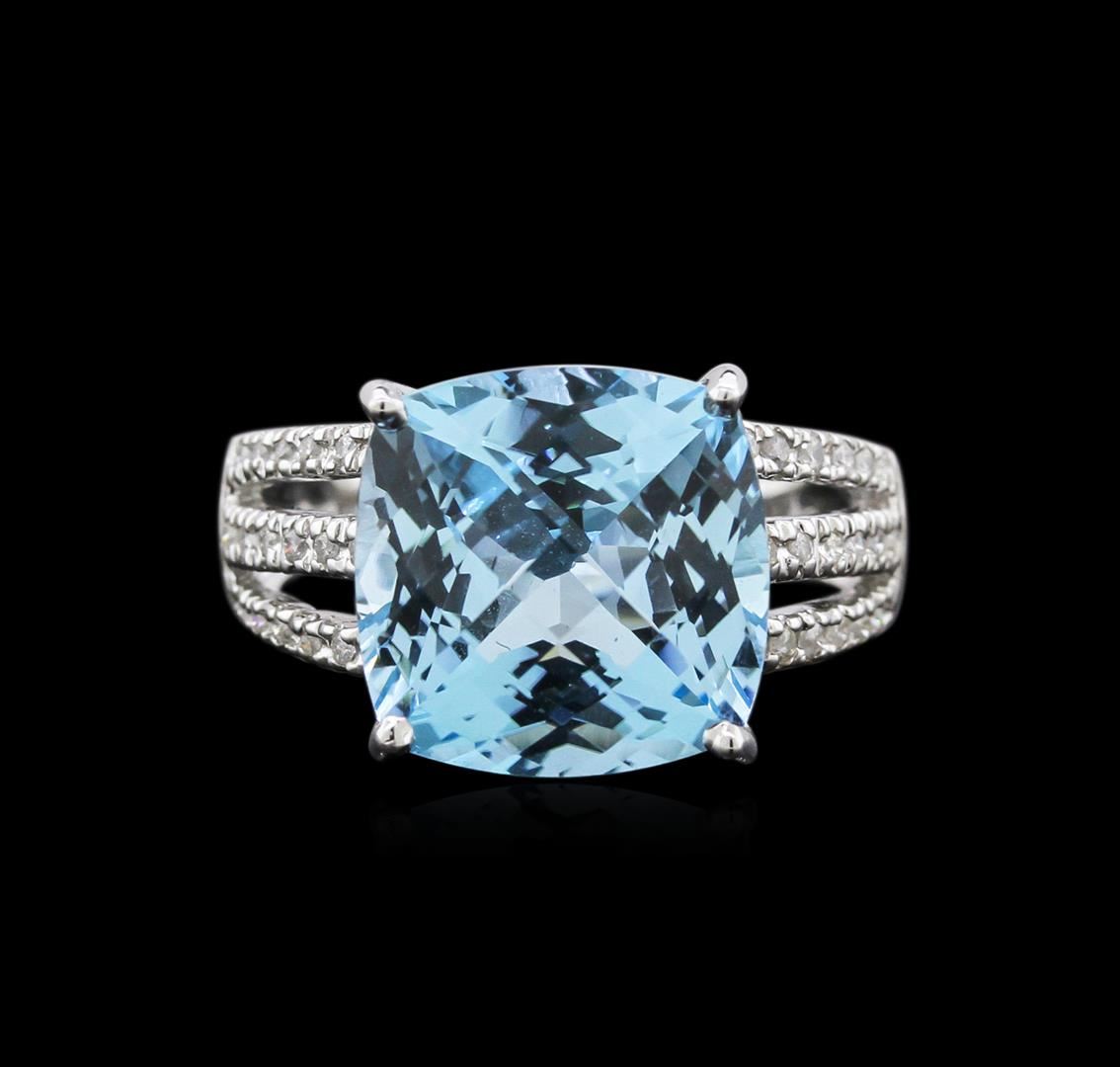 One electronically tested 14KT white gold ladies cast topaz and diamond ring with a split shoulder shank with a bright polish finish. Trademark is TY. Identified with markings of "14K". Condition is new. Containing: One prong set square cushion modified mixed cut natural blue topaz, measuring 12.02 x 12.00 x 8.28mm, approximate weight of 9.91ct., clarity is eye clean, type I, light, very slightly grayish, blue color, (GIA B 3/3), cut is good. Thirty-Six prong set round brilliant cut diamonds, measuring 1.30 - 1.30 x 0.78mm (depth est.) approximate total weight of 36 Stones = 0.29ct. Clarity: I-1 to I-2. Color: H - I, Cut is Good. All diamonds and colored gemstones are graded in the mounting, unless otherwise stated. Colored gemstones are presumed to have been subjected to commonly used enhancement processes. Total Weight of Colored Stones 9.91ct. Total Weight of Diamonds 0.29ct. Total Weight of Ring 7.00 grams. GGL Appraised at $1,615.00.