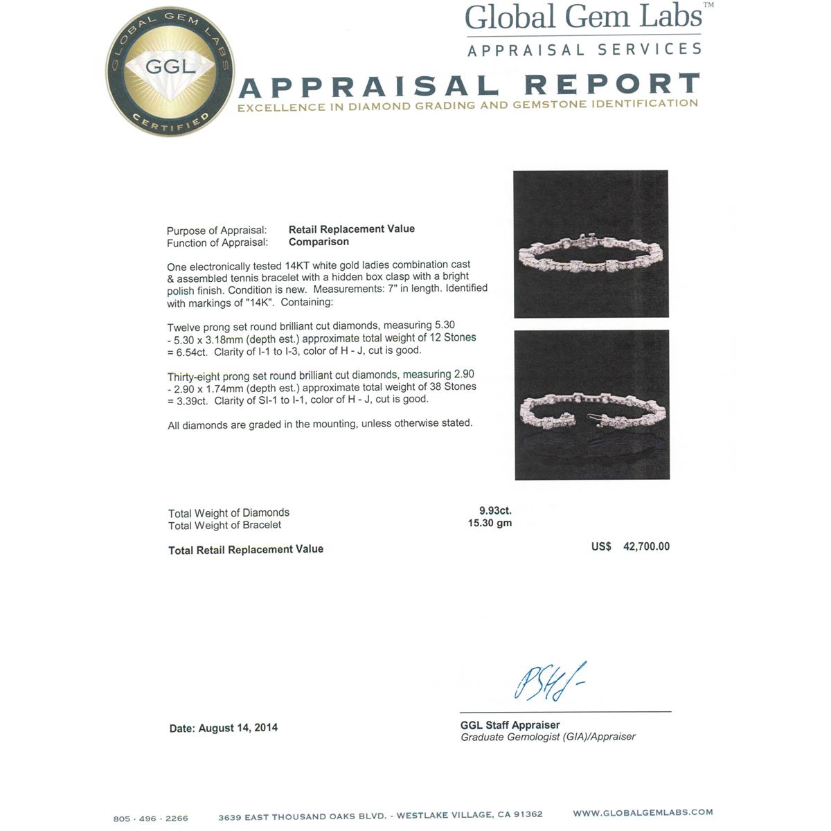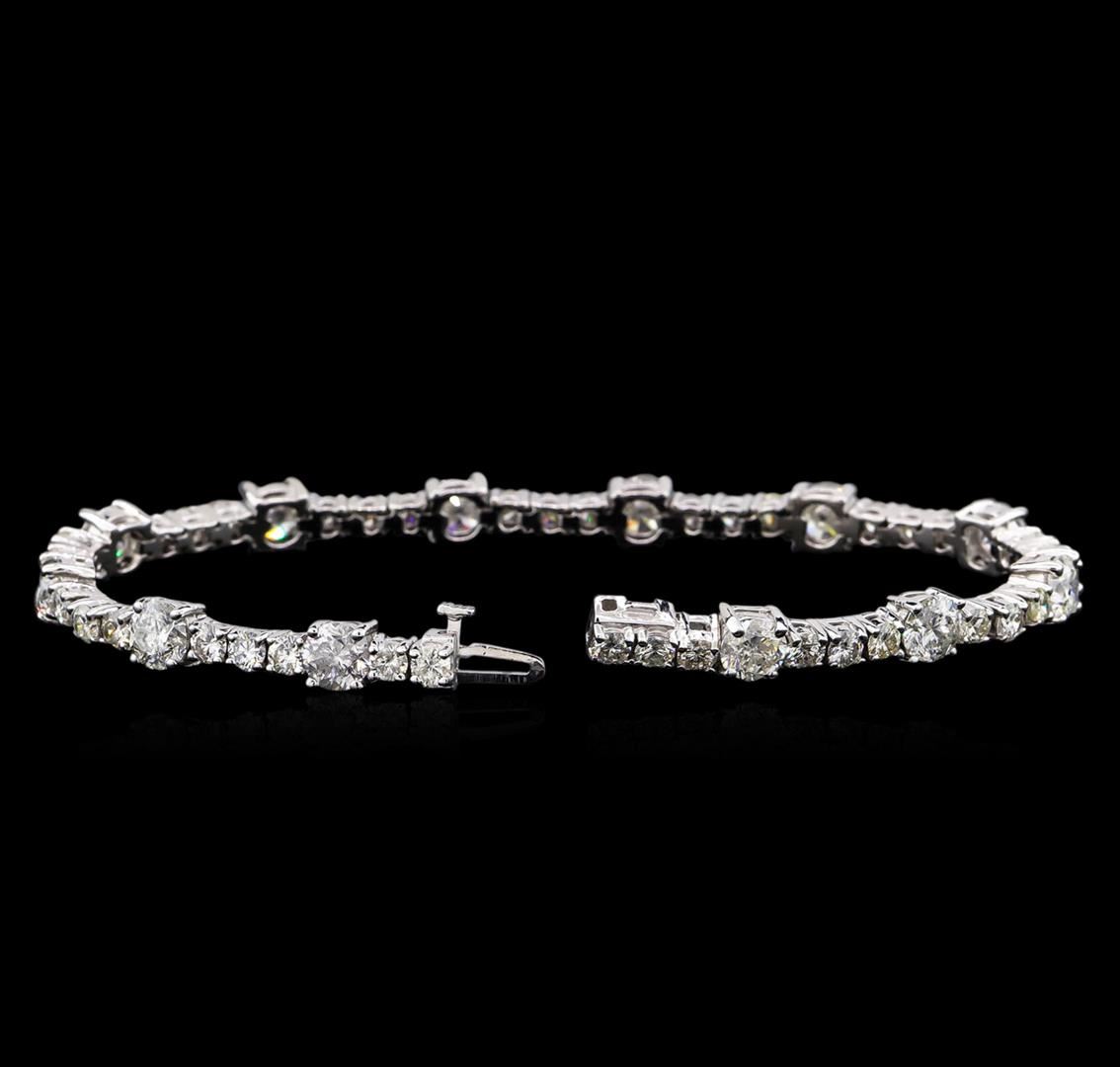 One electronically tested 14KT white gold ladies combination cast & assembled tennis bracelet with a hidden box clasp with a bright polish finish. Condition is new. Measurements: 7" in length. Identified with markings of "14K". Containing: Twelve prong set round brilliant cut diamonds, measuring 5.30 - 5.30 x 3.18mm (depth est.) approximate total weight of 12 Stones = 6.54ct. Clarity: I-1 to I-3. Color: H - J, Cut is Good. Thirty-Eight prong set round brilliant cut diamonds, measuring 2.90 - 2.90 x 1.74mm (depth est.) approximate total weight of 38 Stones = 3.39ct. Clarity: SI-1 to I-1. Color: H - J, Cut is Good. All diamonds are graded in the mounting, unless otherwise stated. Total Weight of Diamonds 9.93ct. Total Weight of Bracelet 15.30 grams. GGL Appraised at $42,700.00.