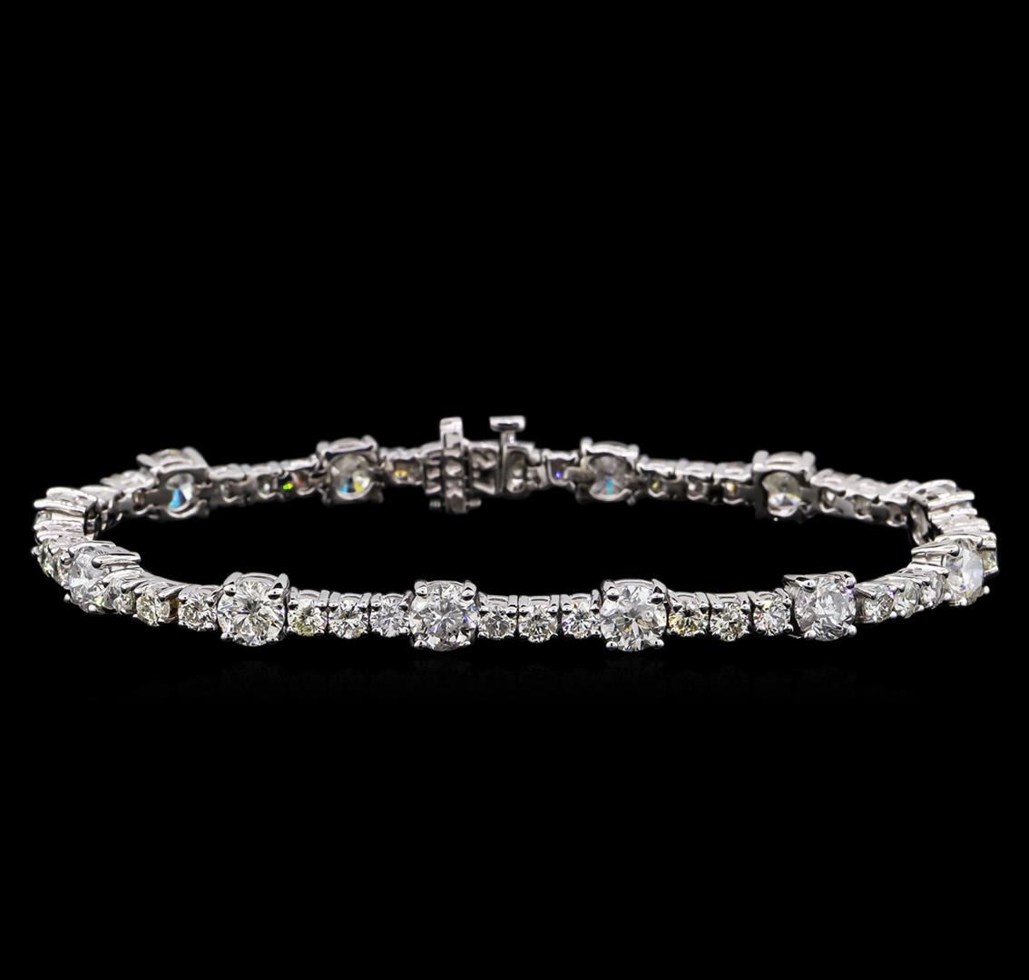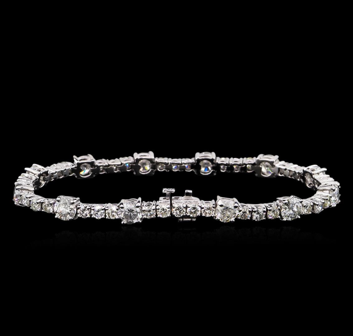 One electronically tested 14KT white gold ladies combination cast & assembled tennis bracelet with a hidden box clasp with a bright polish finish. Condition is new. Measurements: 7" in length. Identified with markings of "14K". Containing: Twelve prong set round brilliant cut diamonds, measuring 5.30 - 5.30 x 3.18mm (depth est.) approximate total weight of 12 Stones = 6.54ct. Clarity: I-1 to I-3. Color: H - J, Cut is Good. Thirty-Eight prong set round brilliant cut diamonds, measuring 2.90 - 2.90 x 1.74mm (depth est.) approximate total weight of 38 Stones = 3.39ct. Clarity: SI-1 to I-1. Color: H - J, Cut is Good. All diamonds are graded in the mounting, unless otherwise stated. Total Weight of Diamonds 9.93ct. Total Weight of Bracelet 15.30 grams. GGL Appraised at $42,700.00.