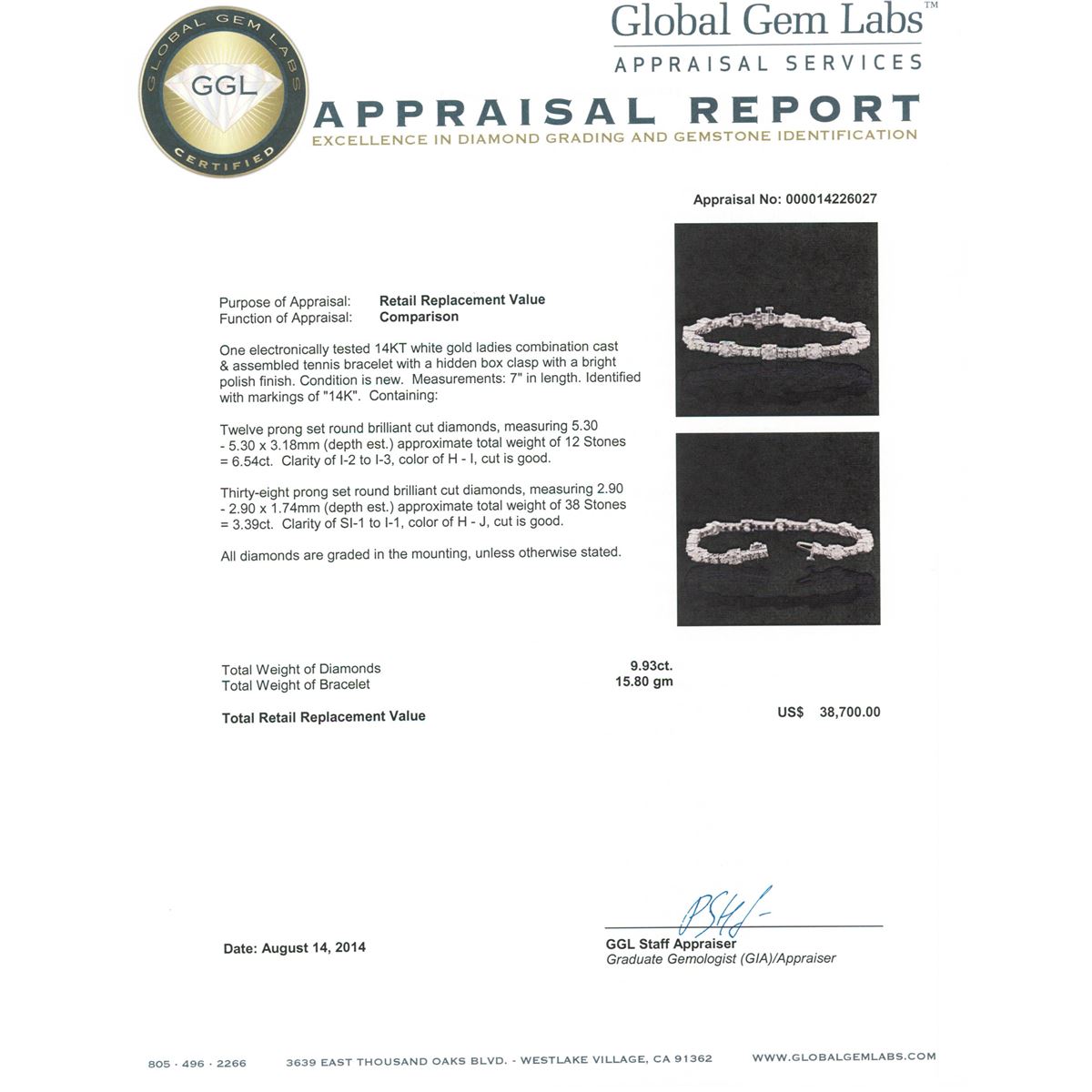 One electronically tested 14KT white gold ladies combination cast & assembled tennis bracelet with a hidden box clasp with a bright polish finish. Condition is new. Measurements: 7" in length. Identified with markings of "14K". Containing: Twelve prong set round brilliant cut diamonds, measuring 5.30 - 5.30 x 3.18mm (depth est.) approximate total weight of 12 Stones = 6.54ct. Clarity: I-2 to I-3. Color: H - I, Cut is Good. Thirty-Eight prong set round brilliant cut diamonds, measuring 2.90 - 2.90 x 1.74mm (depth est.) approximate total weight of 38 Stones = 3.39ct. Clarity: SI-1 to I-1. Color: H - J, Cut is Good. All diamonds are graded in the mounting, unless otherwise stated. Total Weight of Diamonds 9.93ct. Total Weight of Bracelet 15.80 grams. GGL Appraised at $38,700.00.