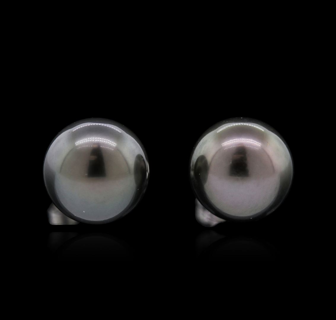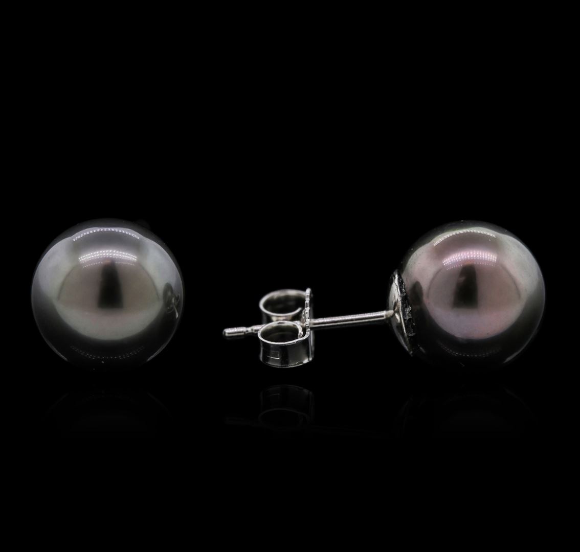 One pair of earrings featuring: 14KT white gold weighing 2.26 grams containing two 9.00 mm black fresh water pearls.