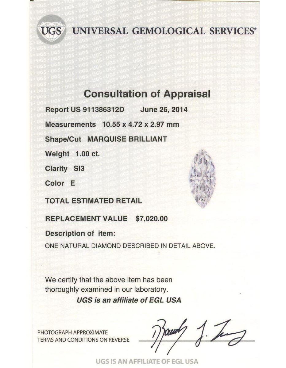 One ring featuring: 14KT White Gold with a total weight of 6.70 grams, (6) diamonds with a total weight of 0.70ctw, and one center diamond with a total weight of 1.00ct. Center diamond UGS Appraised at $9,800.00.