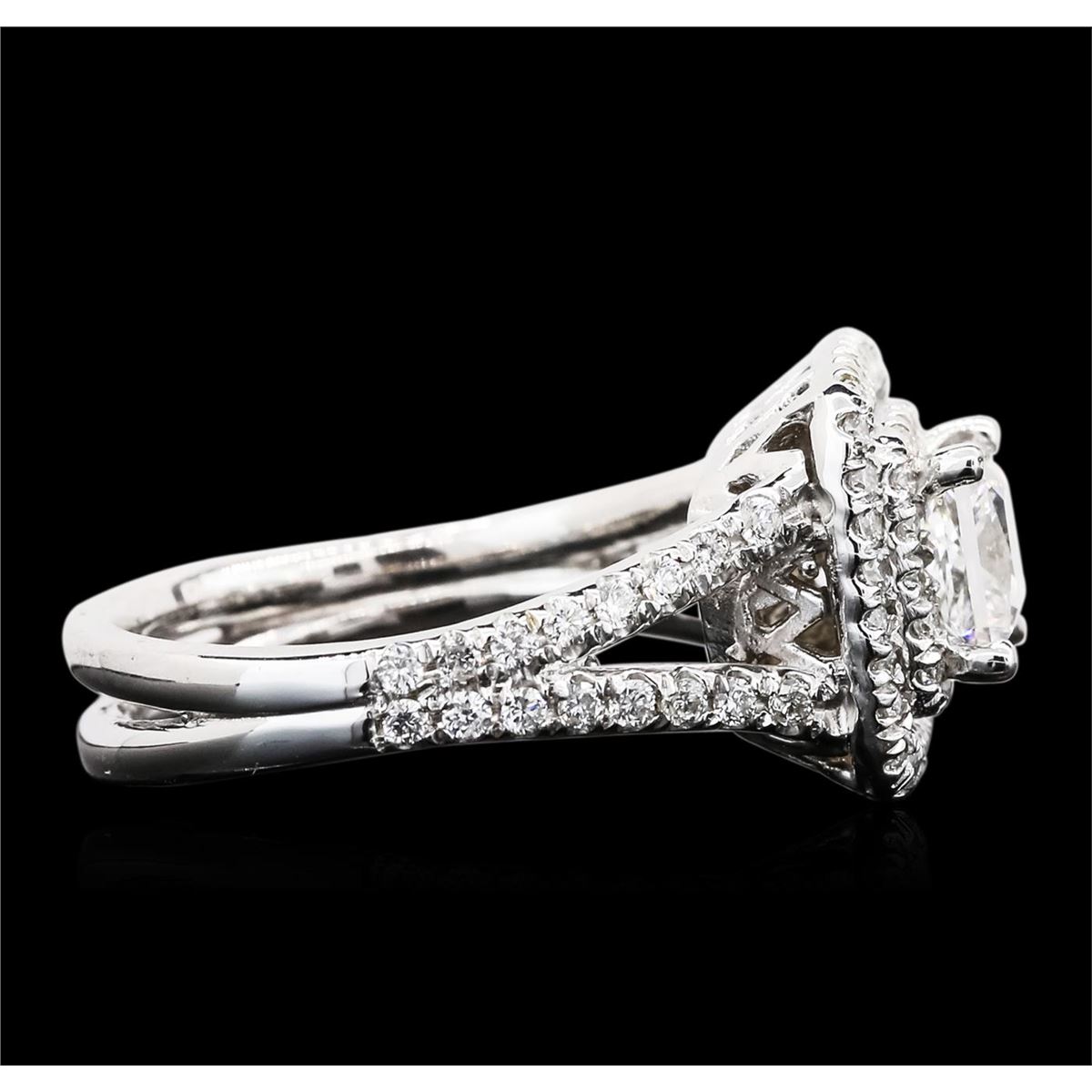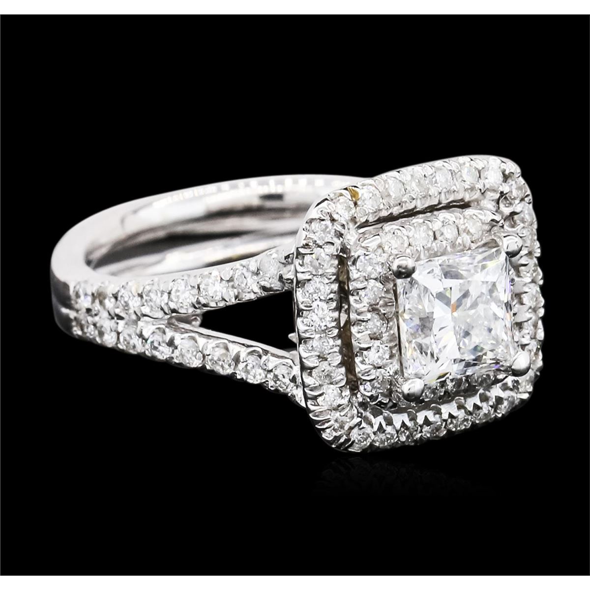 One electronically tested 14KT white gold ladies cast diamond unity ring with a bright polish finish. The featured diamond is set within tiered diamond bezels supported by diamond set split shoulders, completed by a grooved four millimeter wide band. Identified with markings of "14K". Condition is new, good workmanship. Containing: One prong set princess cut diamond, measuring 5.69 x 5.42 x 4.22mm exact weight 1.20ct. EGL Report attached. Graded loose prior to setting in the EGL Laboratory Report #US 88182017D. Clarity: VS-2. Color: E. Depth 79.9%. Table 65.0%. Pavil. Depth%. 54.1%. Eighty prong set round brilliant cut diamonds, measuring 1.40 - 1.20 x 0.78mm (depth est.) approximate total weight of 80 Stones = 0.74ct. Graded in the setting. Clarity: SI-1 to I-1. Color: F - H. Total Weight of Diamonds 1.94ct. Total Weight of Ring 6.65 grams. AIG Appraised at $36,800.00.