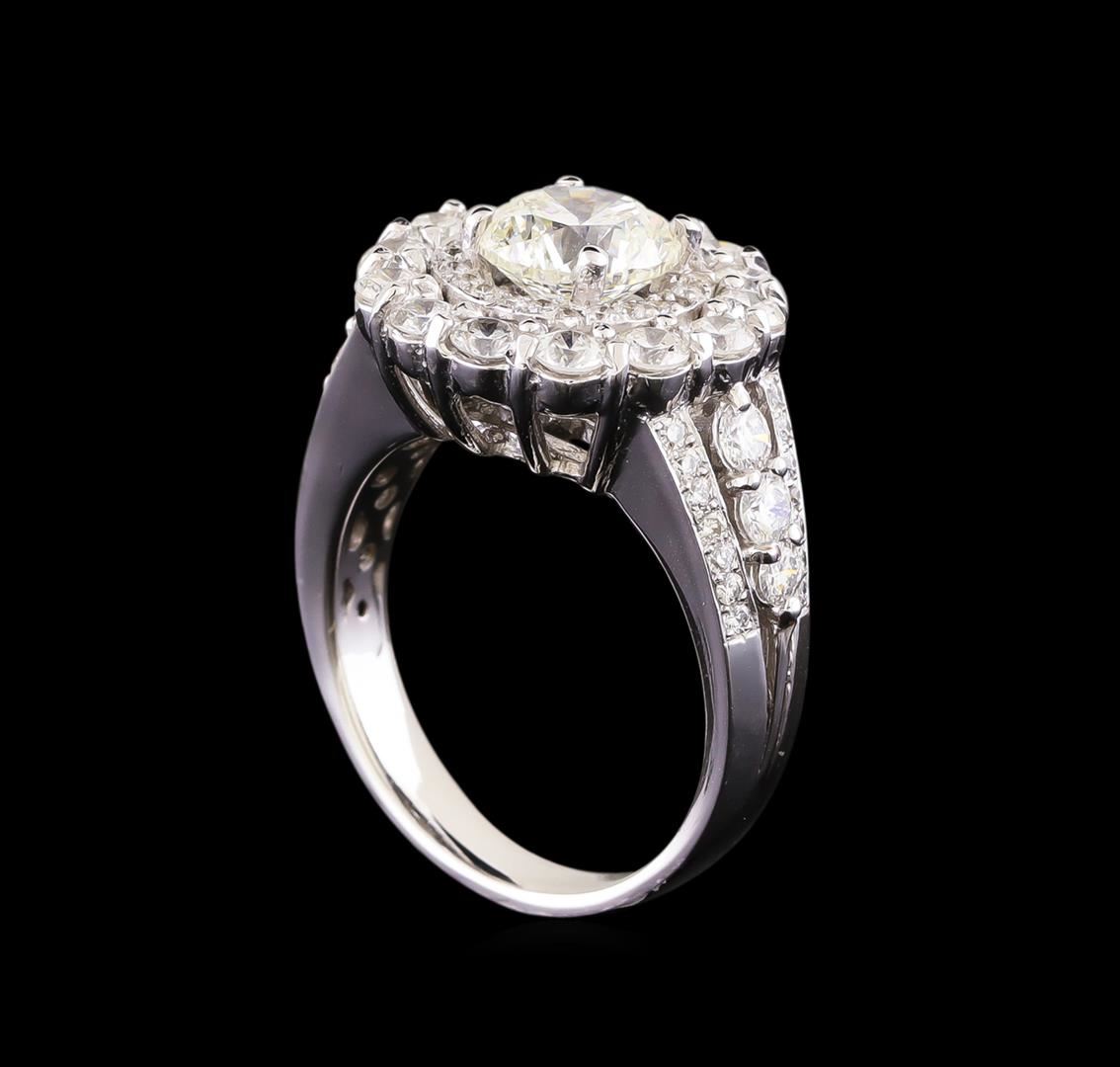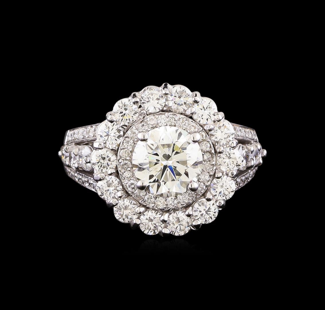 One electronically tested 14KT white gold ladies cast diamond unity ring with a bright polish finish. The featured diamond is set within two diamond bezels supported by elaborate diamond set shoulders, completed by a three millimeter wide band. Identified with markings of "K14". Condition is new, good workmanship. Containing: One prong set round brilliant cut diamond, measuring 7.37 - 7.31 x 4.84mm exact weight 1.72ct. EGL Report attached. Graded loose prior to setting in the EGL Laboratory Report #US 77991104D. Clarity: SI-1. Color: I. Depth 65.9%. Table 59.0%. Pavil. Depth% 43.2%. Twenty prong set round brilliant cut diamonds, measuring 2.70 - 2.60 x 1.59mm (depth est.) approximate total weight of 20 Stones = 1.46ct. Graded in the setting. Clarity: SI-1 to SI-2. Color: G - H Fifty-Two prong set round brilliant cut diamonds, measuring 1.30 - 1.20 x 0.75mm (depth est.) approximate total weight of 52 Stones = 0.47ct. Graded in the setting. Clarity: SI-1 to SI-2. Color: G - H. Total Weight of Diamonds 3.65ct. Total Weight of Ring 8.90 grams. AIG Appraised at $35,045.00.