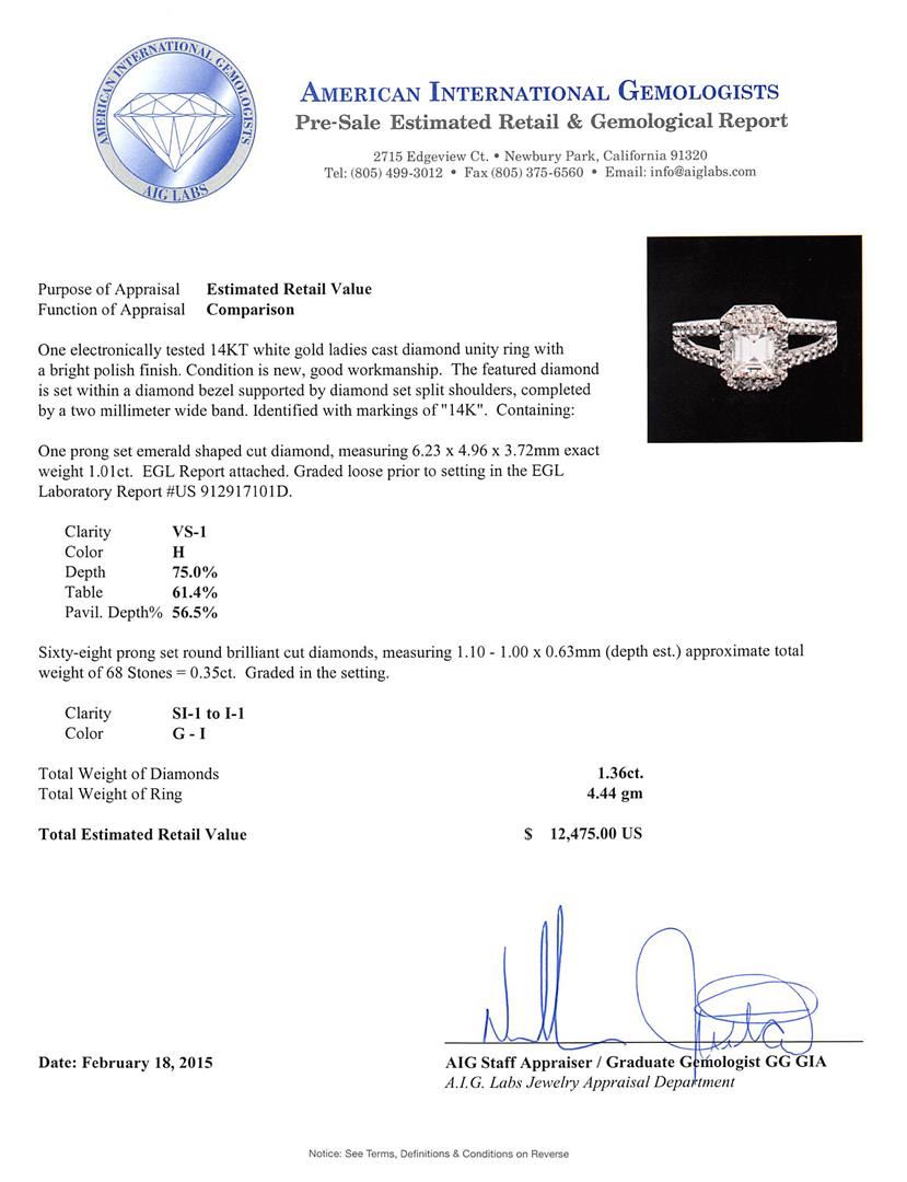 One electronically tested 14KT white gold ladies cast diamond unity ring with a bright polish finish. The featured diamond is set within a diamond bezel supported by diamond set split shoulders, completed by a two millimeter wide band. Identified with markings of "14K". Condition is new, good workmanship. Containing: One prong set emerald shaped cut diamond, measuring 6.23 x 4.96 x 3.72mm exact weight 1.01ct. EGL Report attached. Graded loose prior to setting in the EGL Laboratory Report #US 912917101D. Clarity: VS-1. Color: H. Depth 75.0%. Table 61.4%. Pavil. Depth%. 56.5%. Sixty-Eight prong set round brilliant cut diamonds, measuring 1.10 - 1.00 x 0.63mm (depth est.) approximate total weight of 68 Stones = 0.35ct. Graded in the setting. Clarity: SI-1 to I-1. Color: G - I. Total Weight of Diamonds 1.36ct. Total Weight of Ring 4.44 grams. AIG Appraised at $13,615.00.