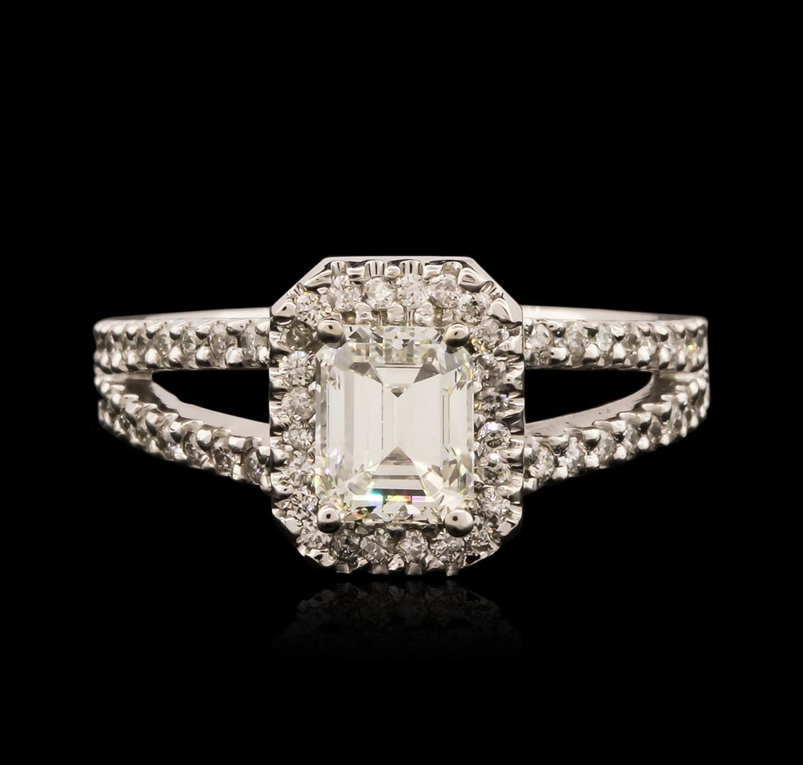 One electronically tested 14KT white gold ladies cast diamond unity ring with a bright polish finish. The featured diamond is set within a diamond bezel supported by diamond set split shoulders, completed by a two millimeter wide band. Identified with markings of "14K". Condition is new, good workmanship. Containing: One prong set emerald shaped cut diamond, measuring 6.23 x 4.96 x 3.72mm exact weight 1.01ct. EGL Report attached. Graded loose prior to setting in the EGL Laboratory Report #US 912917101D. Clarity: VS-1. Color: H. Depth 75.0%. Table 61.4%. Pavil. Depth%. 56.5%. Sixty-Eight prong set round brilliant cut diamonds, measuring 1.10 - 1.00 x 0.63mm (depth est.) approximate total weight of 68 Stones = 0.35ct. Graded in the setting. Clarity: SI-1 to I-1. Color: G - I. Total Weight of Diamonds 1.36ct. Total Weight of Ring 4.44 grams. AIG Appraised at $13,615.00.