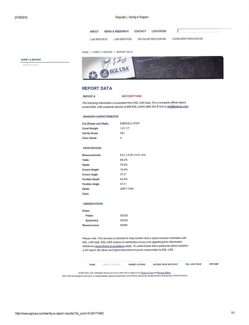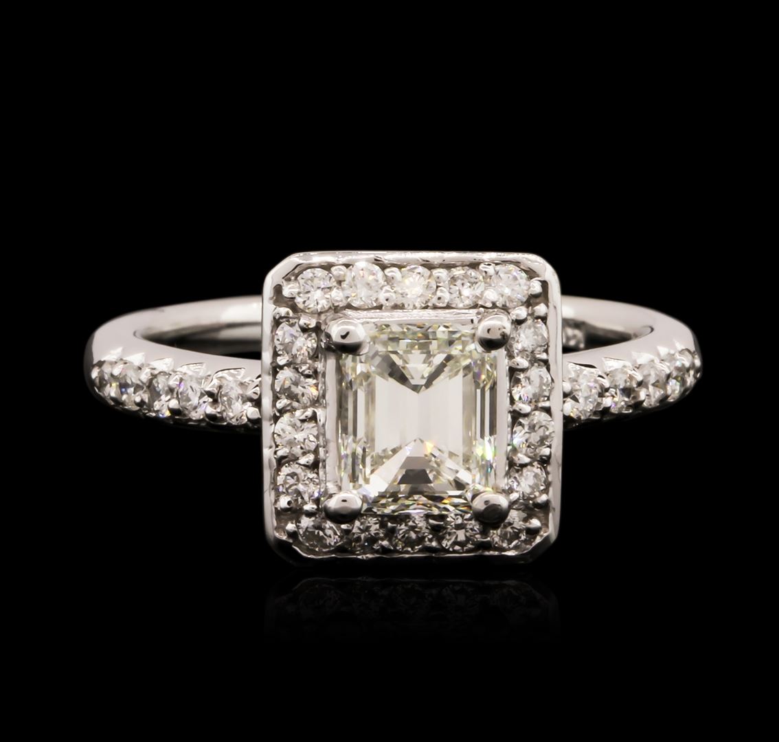 One electronically tested 14KT white gold ladies cast diamond unity ring with a bright polish finish. The featured diamond is set within a diamond bezel supported by diamond set shoulders, completed by a two millimeter wide band. Identified with markings of "14K". Condition is new, good workmanship. Containing: One prong set emerald shaped cut diamond, measuring 6.21 x 4.99 x 3.91mm exact weight 1.01ct. EGL Report attached. Graded loose prior to setting in the EGL Laboratory Report #US 912917104D. Clarity: VS-1. Color: H. Depth 78.4%. Table 68.2%. Pavil. Depth%. 62.9%. Twenty-Eight prong set round brilliant cut diamonds, measuring 1.60 - 1.50 x 0.93mm (depth est.) approximate total weight of 28 Stones = 0.35ct. Graded in the setting. Clarity: SI-1 to SI-2. Color: G - I. Total Weight of Diamonds 1.36ct. Total Weight of Ring 5.00 grams. AIG Appraised at $11,270.00.
