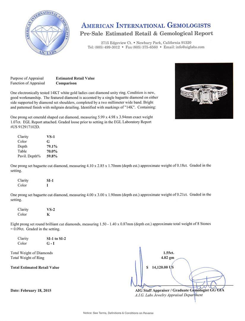 One electronically tested 14KT white gold ladies cast diamond unity ring. The featured diamond is accented by a single baguette diamond on either side supported by diamond set shoulders, completed by a two millimeter wide band. Bright and patterned finish with milgrain detailing. Identified with markings of "14K". Condition is new, good workmanship. Containing: One prong set emerald shaped cut diamond, measuring 5.99 x 4.98 x 3.94mm exact weight 1.07ct. EGL Report attached. Graded loose prior to setting in the EGL Laboratory Report#US 912917102D. Clarity: VS-1. Color: G. Depth 79.1%. Table 70.0%. Pavil. Depth%. 59.8%. One prong set baguette cut diamond, measuring 4.10 x 2.85 x 1.70mm (depth est.) approximate weight of 0.18ct. Graded in the setting. Clarity: SI-1. Color: I One prong set baguette cut diamond, measuring 4.00 x 3.00 x 1.90mm (depth est.) approximate weight of 0.21ct. Graded in the setting. Clarity: VS-2. Color: K Eight prong set round brilliant cut diamonds, measuring 1.50 - 1.40 x 0.87mm (depth est.) approximate total weight of 8 Stones = 0.09ct. Graded in the setting. Clarity: SI-1 to SI-2. Color: G - I. Total Weight of Diamonds 1.55ct. Total Weight of Ring 4.02 grams. AIG Appraised at $13,615.00.