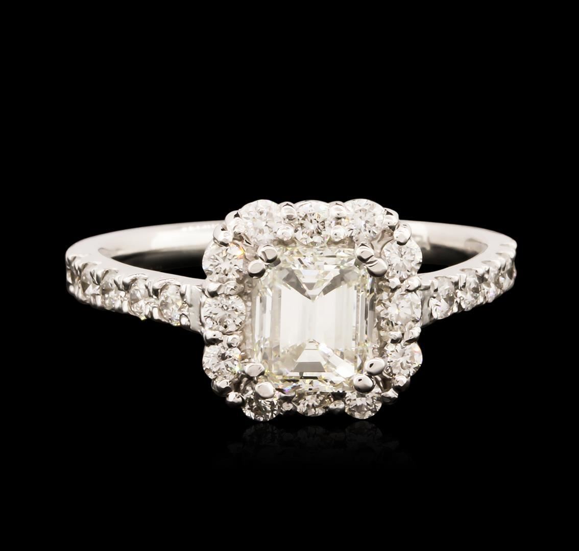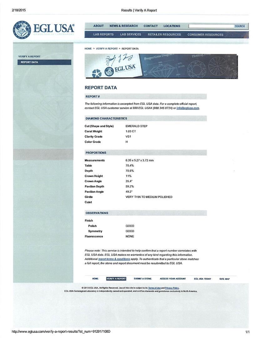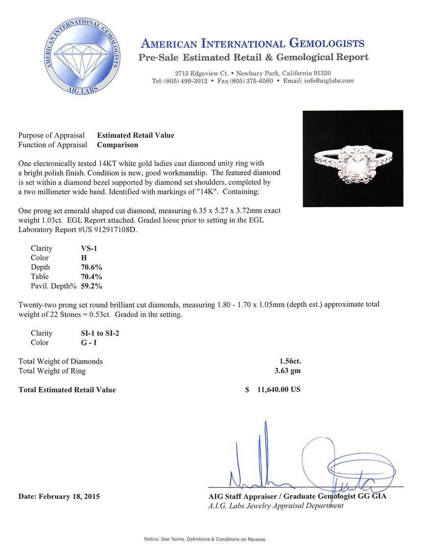 One electronically tested 14KT white gold ladies cast diamond unity ring with a bright polish finish. The featured diamond is set within a diamond bezel supported by diamond set shoulders, completed by a two millimeter wide band. Identified with markings of "14K". Condition is new, good workmanship. Containing: One prong set emerald shaped cut diamond, measuring 6.35 x 5.27 x 3.72mm exact weight 1.03ct. EGL Report attached. Graded loose prior to setting in the EGL Laboratory Report #US 912917108D. Clarity: VS-1. Color: H. Depth 70.6%. Table 70.4%. Pavil. Depth%. 59.2%. Twenty-Two prong set round brilliant cut diamonds, measuring 1.80 - 1.70 x 1.05mm (depth est.) approximate total weight of 22 Stones = 0.53ct. Graded in the setting. Clarity: SI-1 to SI-2. Color: G - I. Total Weight of Diamonds 1.56ct. Total Weight of Ring 3.63 grams. AIG Appraised.