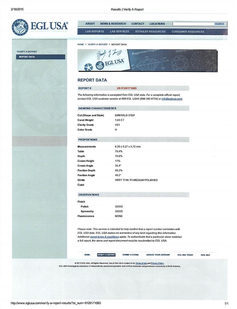 One electronically tested 14KT white gold ladies cast diamond unity ring with a bright polish finish. The featured diamond is set within a diamond bezel supported by diamond set shoulders, completed by a two millimeter wide band. Identified with markings of "14K". Condition is new, good workmanship. Containing: One prong set emerald shaped cut diamond, measuring 6.35 x 5.27 x 3.72mm exact weight 1.03ct. EGL Report attached. Graded loose prior to setting in the EGL Laboratory Report #US 912917108D. Clarity: VS-1. Color: H. Depth 70.6%. Table 70.4%. Pavil. Depth%. 59.2%. Twenty-Two prong set round brilliant cut diamonds, measuring 1.80 - 1.70 x 1.05mm (depth est.) approximate total weight of 22 Stones = 0.53ct. Graded in the setting. Clarity: SI-1 to SI-2. Color: G - I. Total Weight of Diamonds 1.56ct. Total Weight of Ring 3.63 grams. AIG Appraised at $11,640.00.
