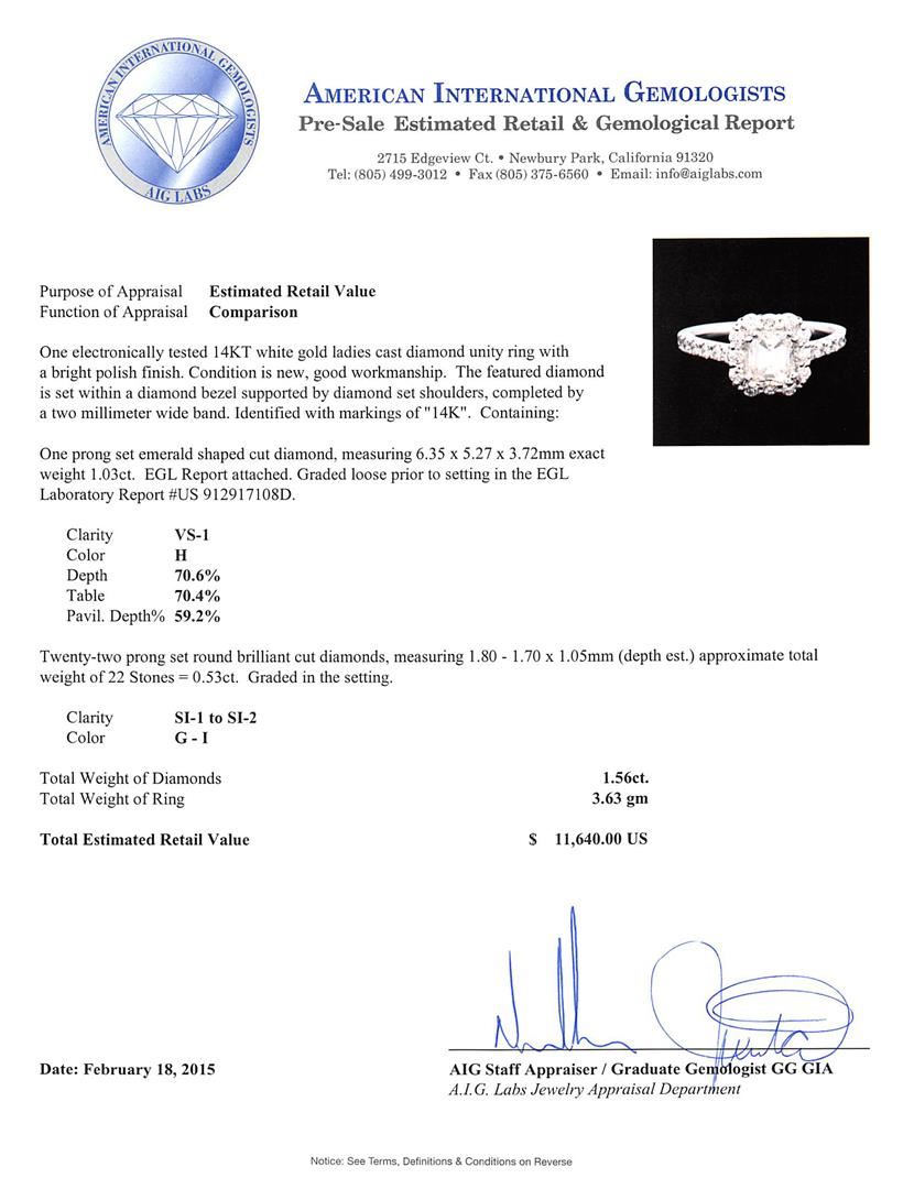 One electronically tested 14KT white gold ladies cast diamond unity ring with a bright polish finish. The featured diamond is set within a diamond bezel supported by diamond set shoulders, completed by a two millimeter wide band. Identified with markings of "14K". Condition is new, good workmanship. Containing: One prong set emerald shaped cut diamond, measuring 6.35 x 5.27 x 3.72mm exact weight 1.03ct. EGL Report attached. Graded loose prior to setting in the EGL Laboratory Report #US 912917108D. Clarity: VS-1. Color: H. Depth 70.6%. Table 70.4%. Pavil. Depth%. 59.2%. Twenty-Two prong set round brilliant cut diamonds, measuring 1.80 - 1.70 x 1.05mm (depth est.) approximate total weight of 22 Stones = 0.53ct. Graded in the setting. Clarity: SI-1 to SI-2. Color: G - I. Total Weight of Diamonds 1.56ct. Total Weight of Ring 3.63 grams. AIG Appraised at $11,640.00.