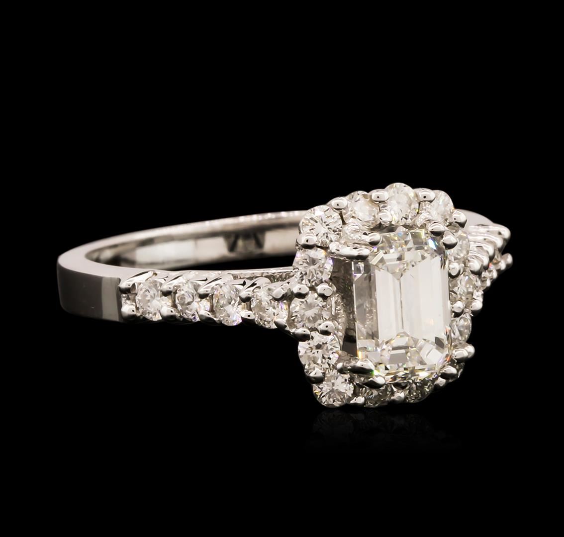One electronically tested 14KT white gold ladies cast diamond unity ring with a bright polish finish. The featured diamond is set within a diamond bezel supported by diamond set shoulders, completed by a two millimeter wide band. Identified with markings of "14K". Condition is new, good workmanship. Containing: One prong set emerald shaped cut diamond, measuring 6.68 x 4.60 x 3.65mm exact weight 1.03ct. EGL Report attached. Graded loose prior to setting in the EGL Laboratory Report #US 912917105D. Clarity: VS-1. Color: G. Depth 79.3%. Table 66.5%. Pavil. Depth%. 59.8%. Twenty-Four prong set round brilliant cut diamonds, measuring 1.90 - 1.60 x 1.05mm (depth est.) approximate total weight of 24 Stones = 0.64ct. Graded in the setting. Clarity: SI-1 to SI-2. Color: F - H. Total Weight of Diamonds 1.67ct. Total Weight of Ring 3.46 grams. AIG Appraised at $13,615.00.