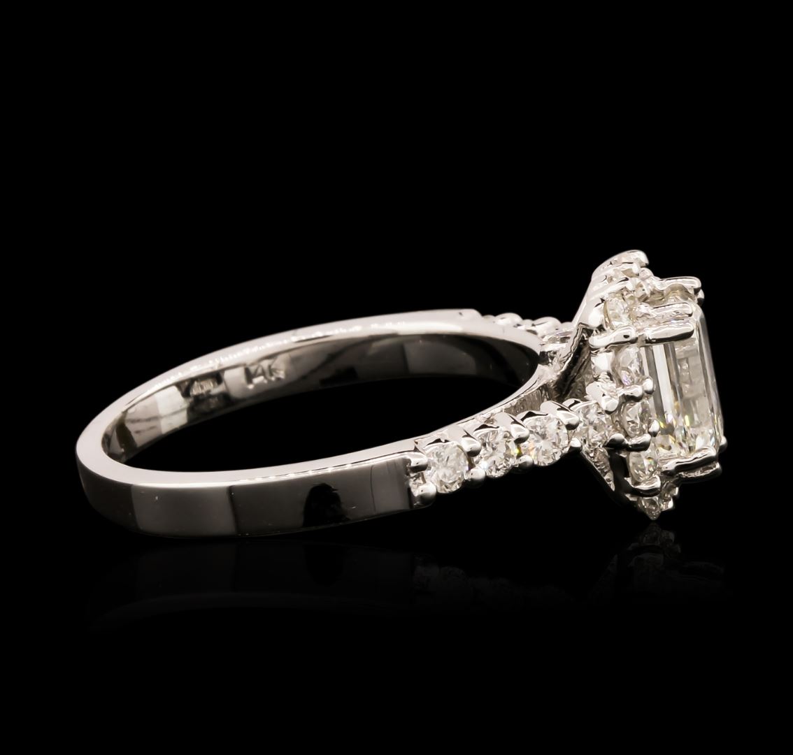 One electronically tested 14KT white gold ladies cast diamond unity ring with a bright polish finish. The featured diamond is set within a diamond bezel supported by diamond set shoulders, completed by a two millimeter wide band. Identified with markings of "14K". Condition is new, good workmanship. Containing: One prong set emerald shaped cut diamond, measuring 6.68 x 4.60 x 3.65mm exact weight 1.03ct. EGL Report attached. Graded loose prior to setting in the EGL Laboratory Report #US 912917105D. Clarity: VS-1. Color: G. Depth 79.3%. Table 66.5%. Pavil. Depth%. 59.8%. Twenty-Four prong set round brilliant cut diamonds, measuring 1.90 - 1.60 x 1.05mm (depth est.) approximate total weight of 24 Stones = 0.64ct. Graded in the setting. Clarity: SI-1 to SI-2. Color: F - H. Total Weight of Diamonds 1.67ct. Total Weight of Ring 3.46 grams. AIG Appraised at $13,615.00.