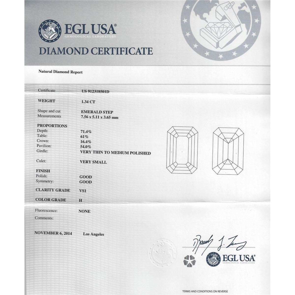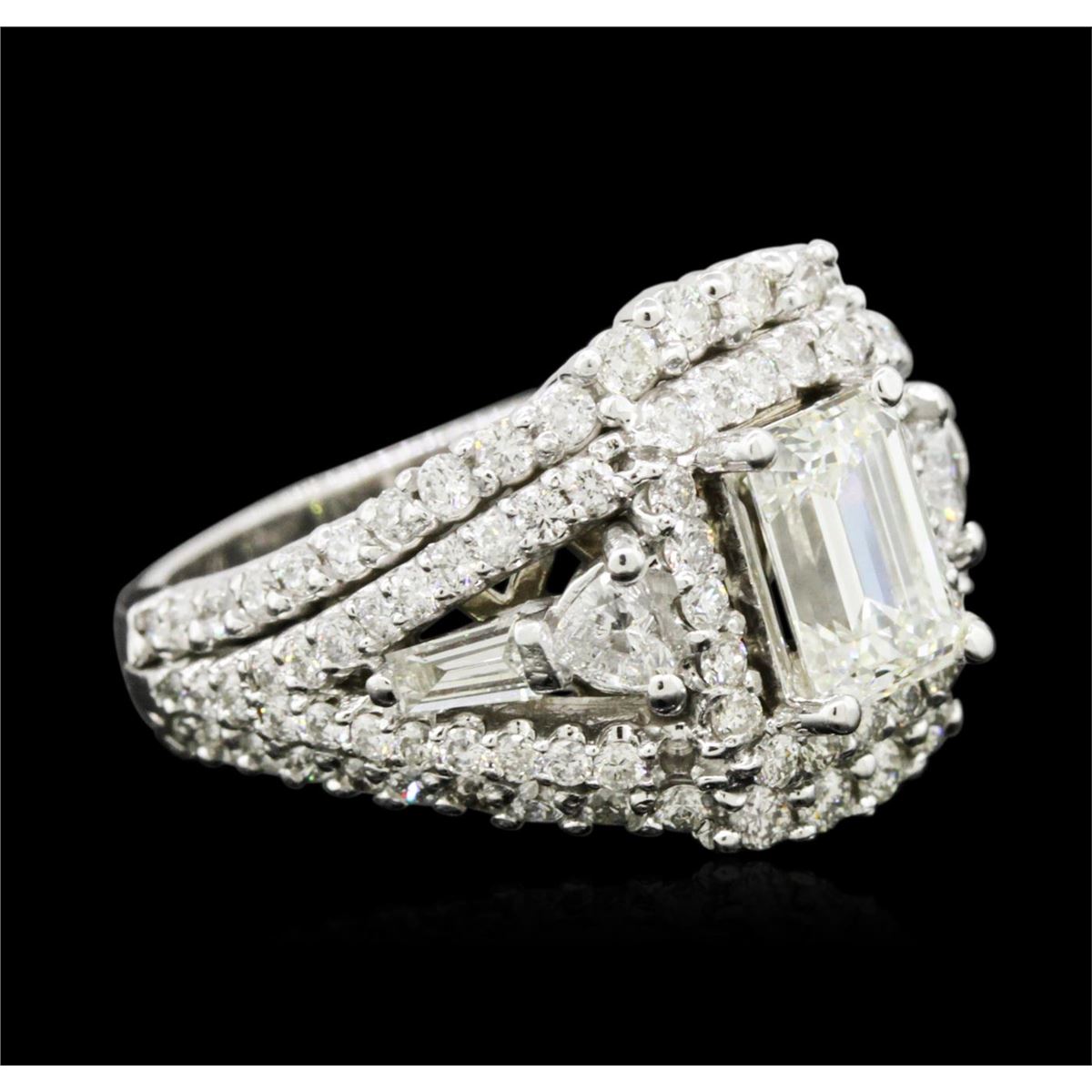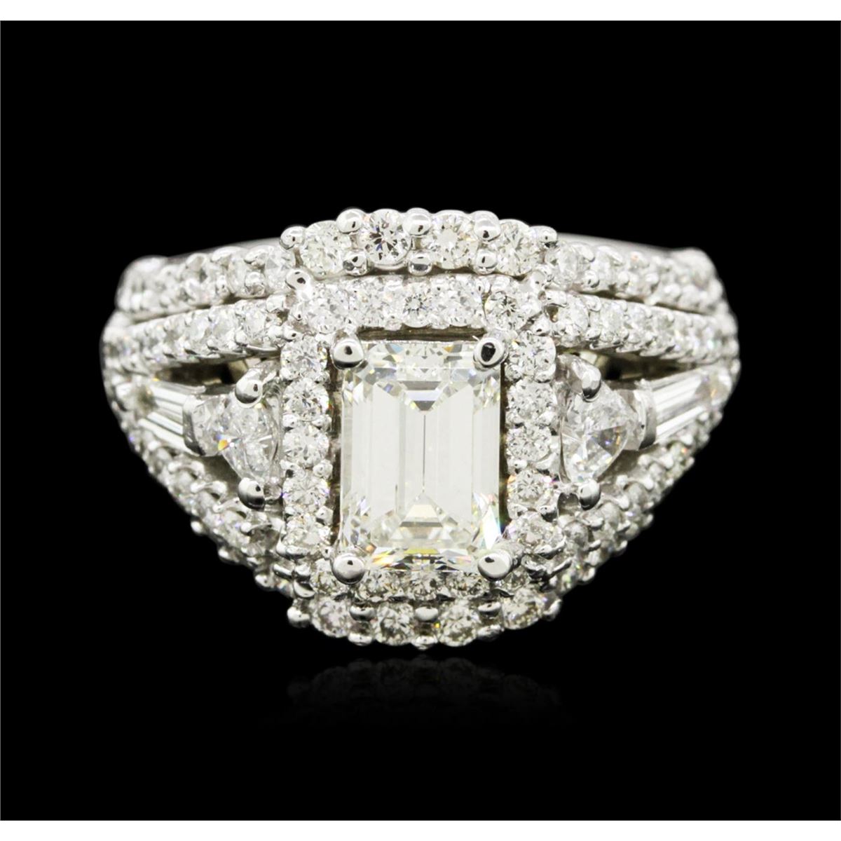 One electronically tested 14KT white gold ladies combination cast & assembled diamond engagement ring with a bright polish finish. Identified with markings of "14K". Condition is new. Containing: One prong set emerald cut diamond, measuring 7.56 x 5.11 x 3.65mm (depth est.) approximate weight of 1.34ct. Clarity: VS-1. Color: H, Cut is Good. Two prong set baguette cut diamonds, measuring 3.50 x 2.00 x 1.70mm (depth est.) approximate total weight of 2 Stones = 0.22ct. Clarity: VS-2. Color: G - H, Cut is Good. Two prong set heart shaped cut diamonds, measuring 3.00 x 2.80 x 1.76mm (depth est.) approximate total weight of 2 Stones = 0.17ct. Clarity: SI-1. Color: F - G, Cut is Good. One Hundred Seven prong set round brilliant cut diamonds, measuring 1.50 - 1.40 x 0.87mm (depth est.) approximate total weight of 107 Stones = 1.19ct. Clarity: SI-2 to I-1. Color: G - H, Cut is Good. All diamonds are graded in the mounting, unless otherwise stated. Total Weight of Diamonds 2.92ct. Total Weight of Engagement Ring 8.10 grams. GGL Appraised at $20,350.00.