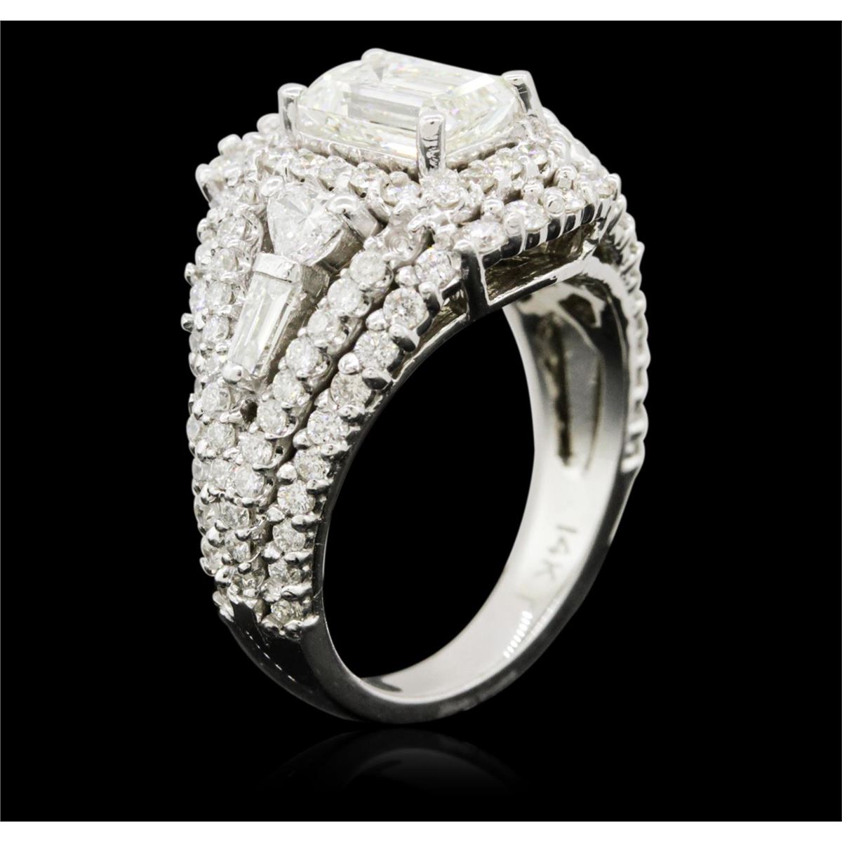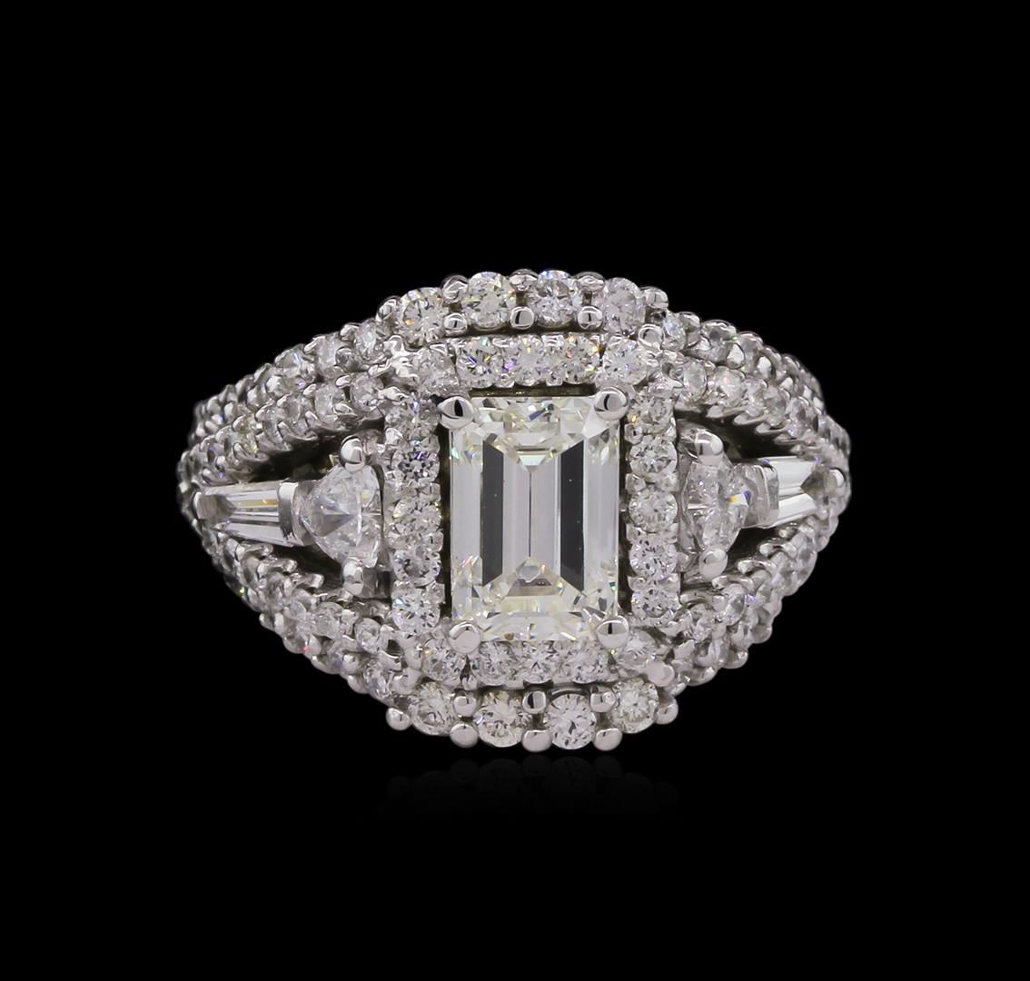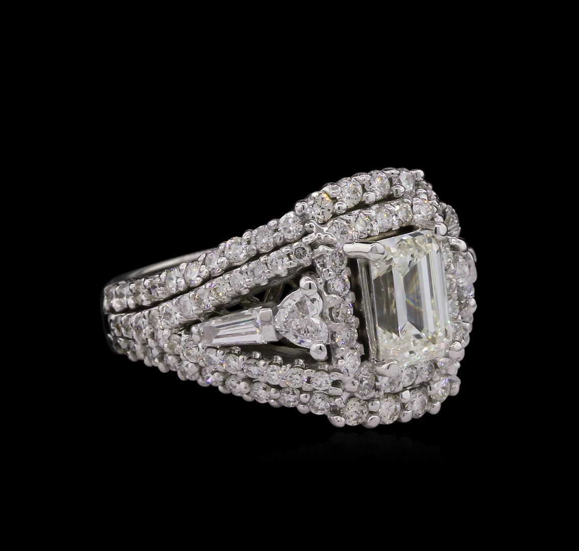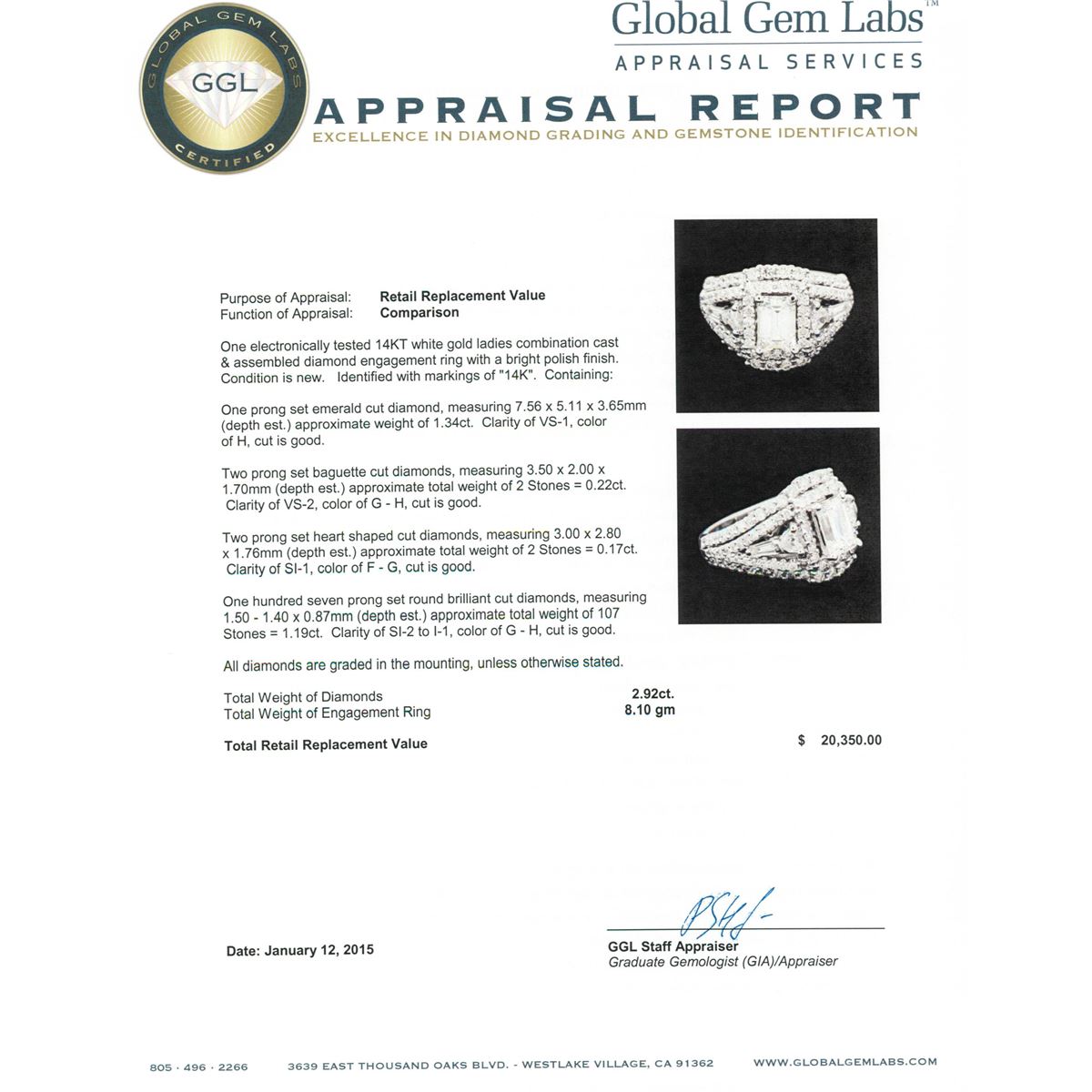 One electronically tested 14KT white gold ladies combination cast & assembled diamond engagement ring with a bright polish finish. Identified with markings of "14K". Condition is new. Containing: One prong set emerald cut diamond, measuring 7.56 x 5.11 x 3.65mm (depth est.) approximate weight of 1.34ct. Clarity: VS-1. Color: H, Cut is Good. Two prong set baguette cut diamonds, measuring 3.50 x 2.00 x 1.70mm (depth est.) approximate total weight of 2 Stones = 0.22ct. Clarity: VS-2. Color: G - H, Cut is Good. Two prong set heart shaped cut diamonds, measuring 3.00 x 2.80 x 1.76mm (depth est.) approximate total weight of 2 Stones = 0.17ct. Clarity: SI-1. Color: F - G, Cut is Good. One Hundred Seven prong set round brilliant cut diamonds, measuring 1.50 - 1.40 x 0.87mm (depth est.) approximate total weight of 107 Stones = 1.19ct. Clarity: SI-2 to I-1. Color: G - H, Cut is Good. All diamonds are graded in the mounting, unless otherwise stated. Total Weight of Diamonds 2.92ct. Total Weight of Engagement Ring 8.10 grams. GGL Appraised at $20,350.00.