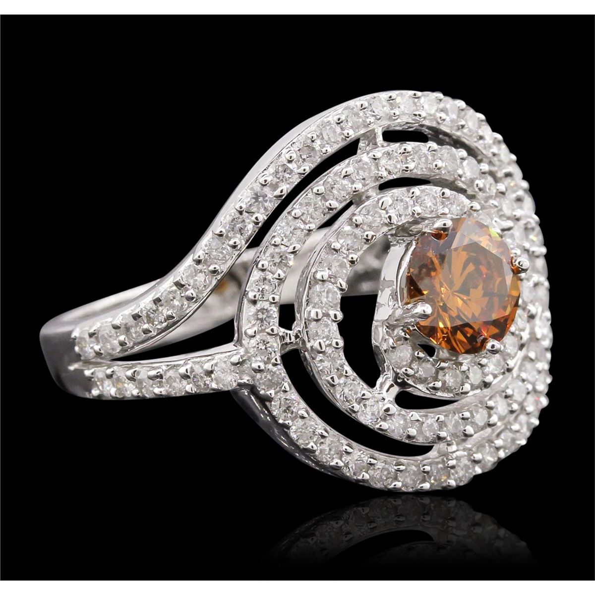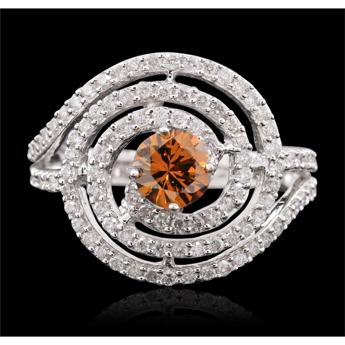 One electronically tested 14KT white gold ladies cast diamond ring with a bright polish finish. Condition is new, good workmanship. The featured diamond is set within swirling diamond bezels supported by diamond set split shoulders, completed by a two and one-half millimeter wide band. Trademark is Orianne. Identified with markings of "14K". Containing: One prong set round brilliant cut diamond, measuring 5.61 - 5.72 x 3.36mm exact weight 0.65ct. GIA Diamond Grading Report attached. Indications of laboratory irradiated enhanced color. Graded loose in the GIA Laboratory, Report #11105526. Clarity VS-2. Color: Fancy Deep Brown-Orange. Depth: 59.3%. Table: 62.0%. One Hundred Four prong set round brilliant cut diamonds, measuring 1.20 - 1.10 x 0.69mm (depth est.) approximate total weight of 104 Stones = 0.67ct. Graded in the setting. Clarity: I-1 to I-2. Color: G - I. Total Weight of Diamonds 1.32ct. Total Weight of Ring 5.34gm. AIG Appraised at $6,995.00.