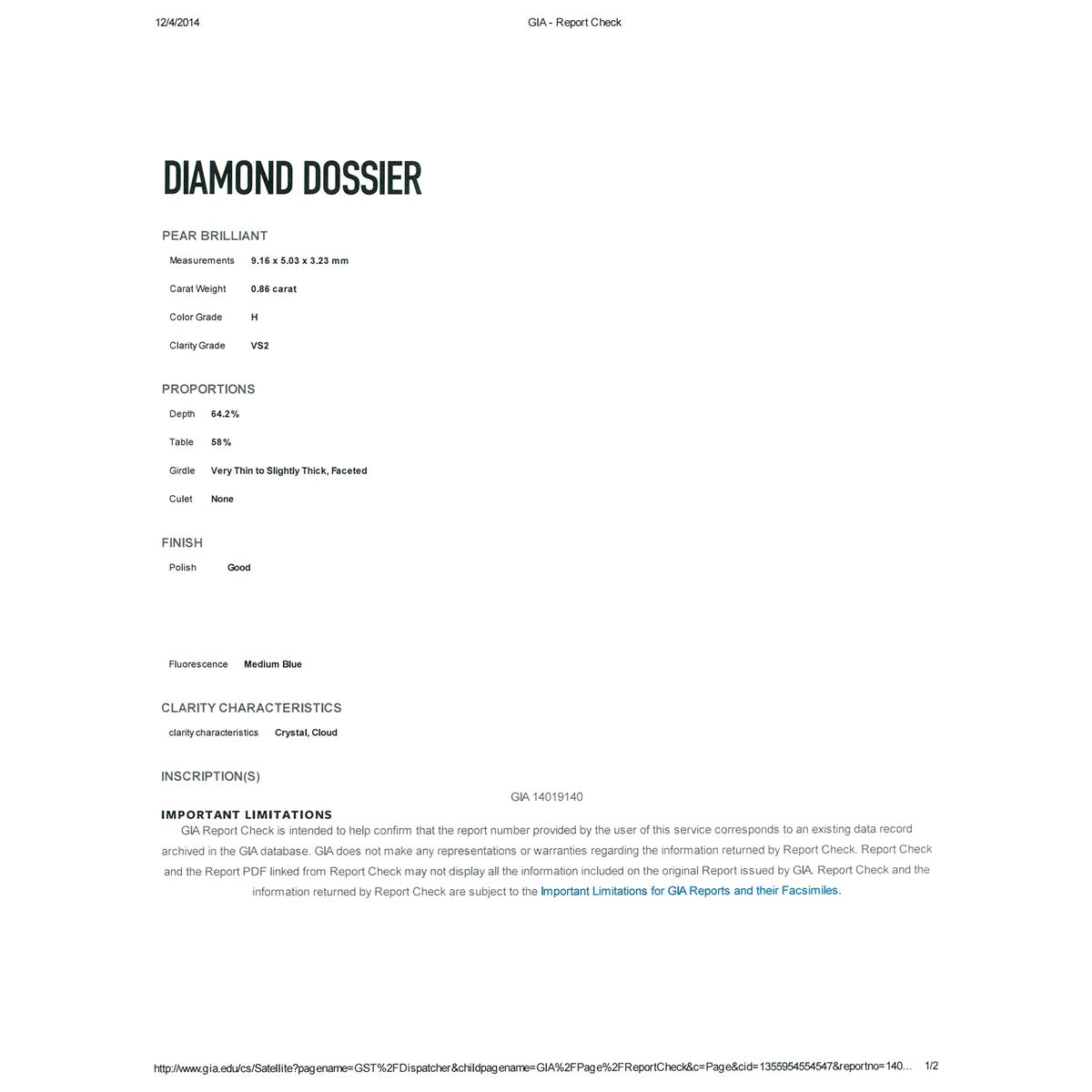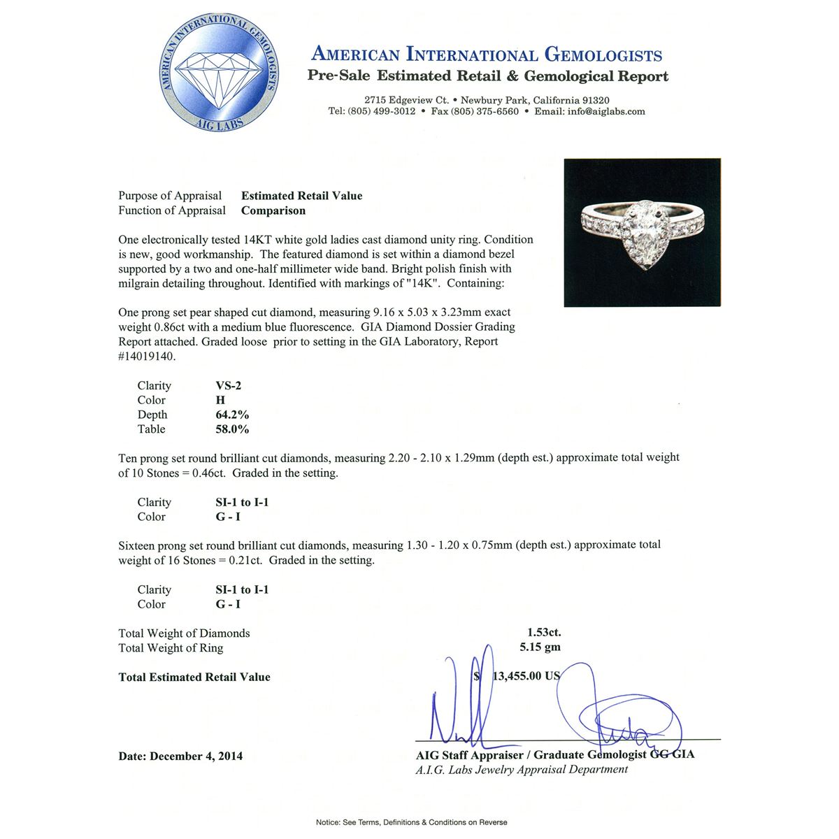 One electronically tested 14KT white gold ladies cast diamond unity ring. The featured diamond is set within a diamond bezel supported by a two and one-half millimeter wide band. Bright polish finish with milgrain detailing throughout. Identified with markings of "14K". Condition is new, good workmanship. Containing: One prong set pear shaped cut diamond, measuring 9.16 x 5.03 x 3.23mm exact weight 0.86ct with a medium blue fluorescence. GIA Diamond Dossier Grading Report attached. Graded loose prior to setting in the GIA Laboratory, Report#14019140. Clarity: VS-2. Color: 64.2%. Table 58.0%. Ten prong set round brilliant cut diamonds, measuring 2.20 - 2.10 x 1.29mm (depth est.) approximate total weight of 10 Stones = 0.46ct. Graded in the setting. Clarity: SI-1 to I-1. Color: G - I Sixteen prong set round brilliant cut diamonds, measuring 1.30 - 1.20 x 0.75mm (depth est.) approximate total weight of 16 Stones = 0.21ct. Graded in the setting. Clarity: SI-1 to I-1. Color: G - I. Total Weight of Diamonds 1.53ct. Total Weight of Ring 5.15 grams. AIG Appraised at $13,455.00.