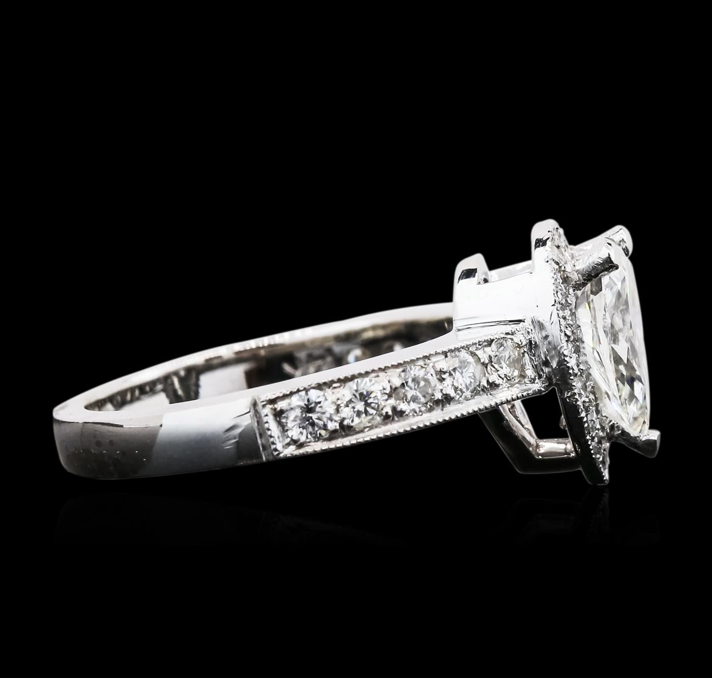 One electronically tested 14KT white gold ladies cast diamond unity ring. The featured diamond is set within a diamond bezel supported by a two and one-half millimeter wide band. Bright polish finish with milgrain detailing throughout. Identified with markings of "14K". Condition is new, good workmanship. Containing: One prong set pear shaped cut diamond, measuring 9.16 x 5.03 x 3.23mm exact weight 0.86ct with a medium blue fluorescence. GIA Diamond Dossier Grading Report attached. Graded loose prior to setting in the GIA Laboratory, Report#14019140. Clarity: VS-2. Color: 64.2%. Table 58.0%. Ten prong set round brilliant cut diamonds, measuring 2.20 - 2.10 x 1.29mm (depth est.) approximate total weight of 10 Stones = 0.46ct. Graded in the setting. Clarity: SI-1 to I-1. Color: G - I Sixteen prong set round brilliant cut diamonds, measuring 1.30 - 1.20 x 0.75mm (depth est.) approximate total weight of 16 Stones = 0.21ct. Graded in the setting. Clarity: SI-1 to I-1. Color: G - I. Total Weight of Diamonds 1.53ct. Total Weight of Ring 5.15 grams. AIG Appraised at $13,455.00.