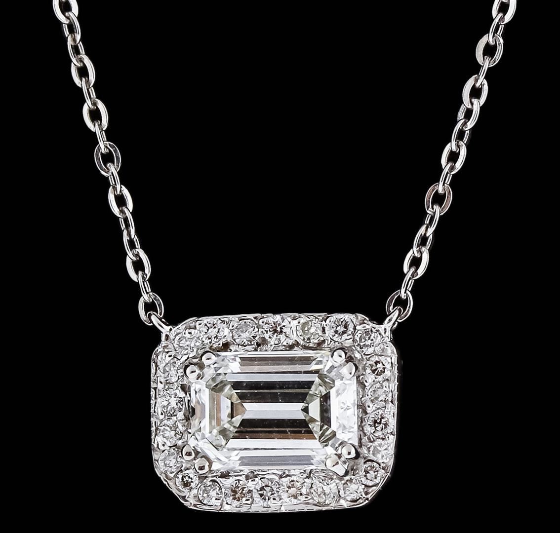 One electronically tested 14KT white gold ladies cast & assembled diamond necklace. Sixteen inch length necklace features a pendant composed of a diamond set within a diamond bezel supported by a diamond station chain, terminating in a lobster claw clasp. Bright polish finish with milgrain detailing. Identified with markings of "585". Condition is new, good workmanship. Containing: One prong set emerald shaped cut diamond, measuring 7.71 x 5.32 x 3.39mm exact weight 1.26ct. GIA Diamond Grading Report attached. Graded loose prior to setting in the GIA Laboratory, Report #16816692. Clarity: VS-1. Color: G. Depth 63.7%. Table 66.0%. Six bezel set round brilliant cut diamonds, measuring 2.20 - 2.10 x 1.29mm (depth est.) approximate total weight of 6 Stones = 0.24ct. Graded in the setting. Clarity: SI-2 to I-1. Color: H - I Twenty-Three prong set round brilliant cut diamonds, measuring 1.30 - 1.20 x 0.75mm (depth est.) approximate total weight of 23 Stones = 0.20ct. Graded in the setting. Clarity: SI-1 to SI-2. Color: G - I. Total Weight of Diamonds 1.70ct. Total Weight of Necklace 4.16 grams. AIG Appraised at $19,195.00.