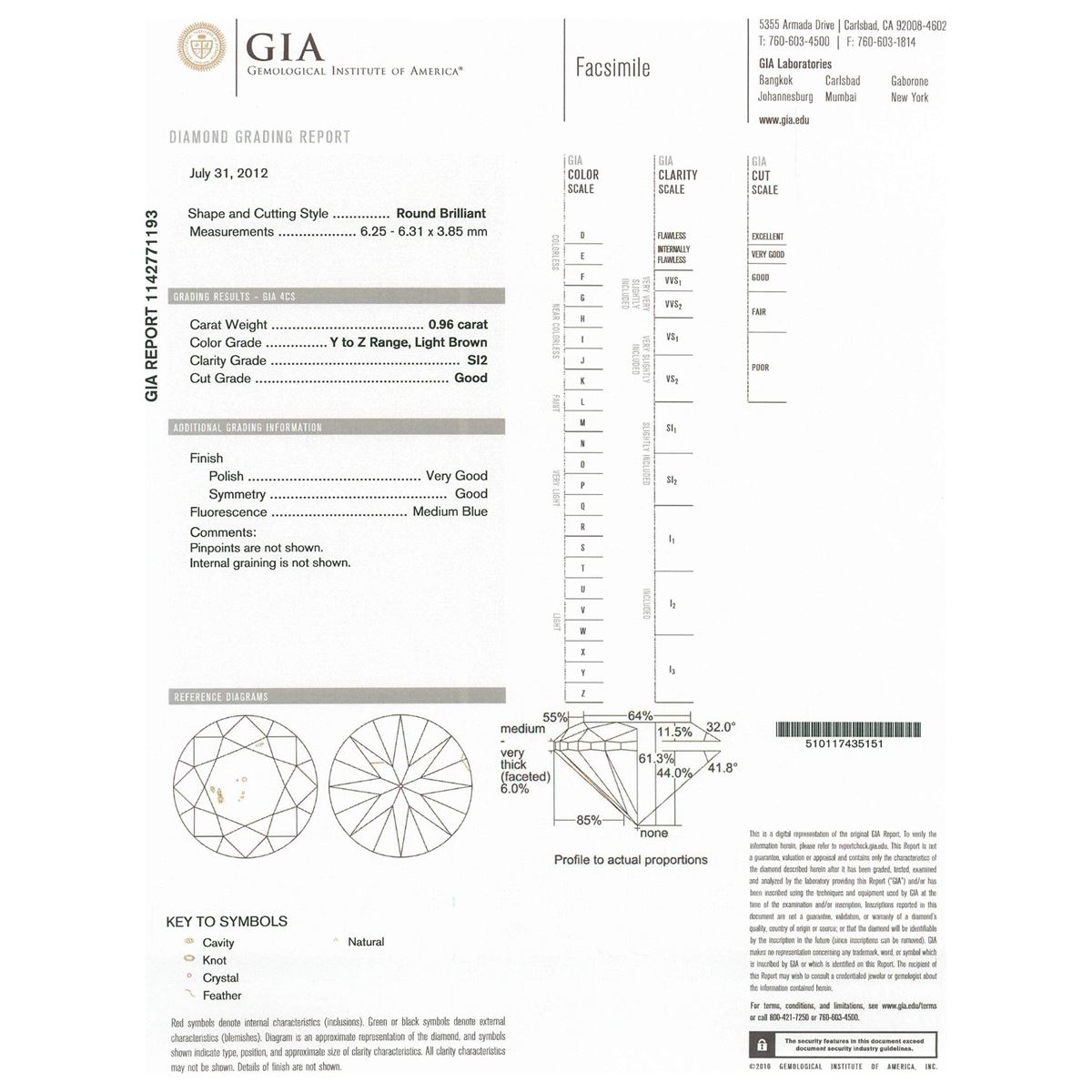 One electronically tested 14KT white gold ladies cast diamond ring with a bright polish finish. Condition is new, good workmanship. The featured diamond is set within a two tiered diamond bezel supported by split shoulders, completed by a one and one-half millimeter wide band. Identified with markings of "K14". Containing: One prong set round brilliant cut diamond, measuring 6.25 - 6.31 x 3.85mm exact weight 0.96ct with a medium blue fluorescence. GIA Diamond Grading Report attached. Graded loose prior to setting in the GIA Laboratory, Report #1142771193. Clarity: SI-2. Depth: 61.3%. Table 64.0%. Pavli. Depth%. 44.0%. Crown Angle 32.0 Degrees Fourteen prong set round brilliant cut diamonds, measuring 2.10 - 2.00. x 1.23mm (depth est.) approximate total weight of 14 Stones = 0.54ct. Graded in the setting. Clarity: I-1 to I-2. Color: G - I Fourteen prong set round brilliant cut diamonds, measuring 1.60 - 1.50 x 0.93mm (depth est.) approximate total weight of 14 Stones = 0.29ct. Graded in the setting. Clarity: I-1 to I-2. Color: G - I. Total Weight of Diamonds 1.79ct. Total Weight of Ring 3.56 grams. AIG Appraised at $10,430.00.