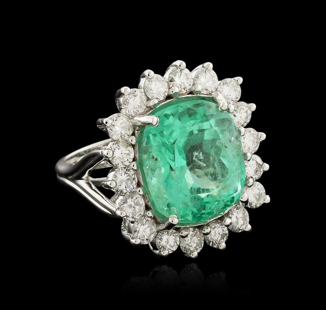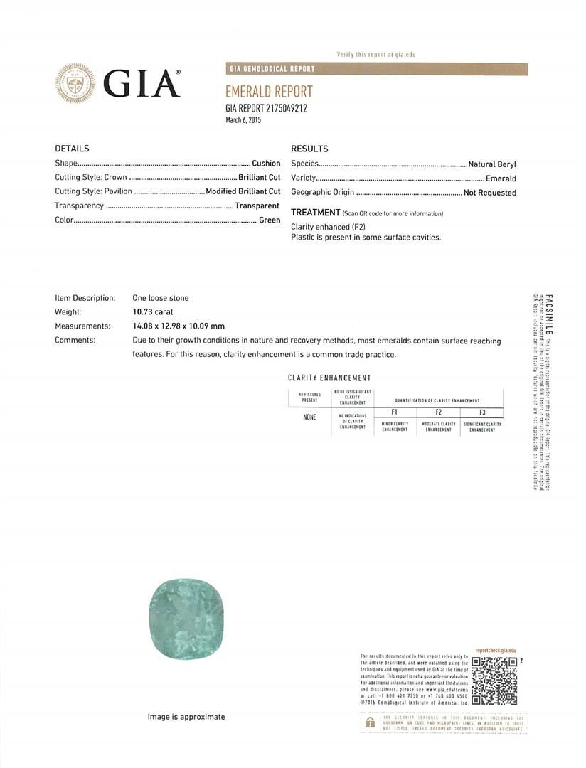 One electronically tested 14KT white gold ladies cast emerald and diamond ring with a bright polish finish. The featured emerald is set within a diamond bezel, completed by a two and one-half millimeter wide band. Identified with markings of "14K". Condition is new, good workmanship. Containing: One prong set cushion modified brilliant cut natural emerald, measuring 14.08 x 12.98 x 10.09mm, exact weight 10.73ct., clarity is heavily included, type III, medium dark, very slightly grayish, green color, (GIA G 6/3), cut is good. Transmitting light with a minimum of distortion, transparent. Naturally occurring internal & external characteristics are present. Moderate clarity enhancement. Plastic is present in some surface cavities. GIA Gemological Report attached. Graded loose prior to setting in the GIA Laboratory, Report #2175049212.Eighteen prong set round brilliant cut diamonds, measuring 3.30 - 3.20 x 1.95mm (depth est.) approximate total weight of 18 Stones = 2.36ct. Graded in the setting. Clarity: SI-2 to I-1. Color: G - H. Total Weight of Colored Stones 10.73ct. Total Weight of Diamonds 2.36ct. Total Weight of Ring 10.50 grams. AIG Appraised at $25,055.00.