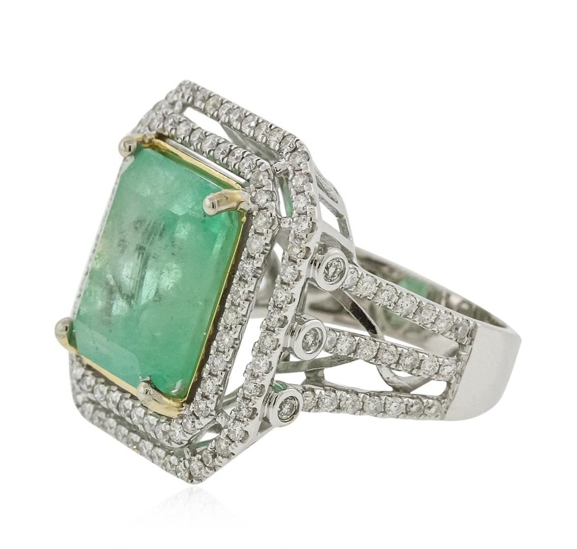 One electronically tested 14KT white gold ladies cast emerald & diamond ring with a bright finish. The featured emerald is set within tiered diamond bezels, supported by an elaborate white gold under gallery and diamond set shoulders, completed by a four millimeter wide band. Identified with markings of 14K. Condition is new, good workmanship. Containing: One prong set octagonal step cut natural emerald, measuring 13.47 x 12.21 x 9.38mm, exact weight 11.28ct., clarity is heavily included, type III, medium light, very slightly grayish, green color, (GIA G 4/3), cut is good. Transmitting light somewhat diffusely, transparent to translucent. Naturally occurring internal & external characteristics are present. Indications of clarity enhancement. Graded loose prior to setting in the GIA Laboratory, Report # 6167542584. The GIA Report is attached. One Hundred Thirty-Eight prong set round brilliant cut diamonds, measuring 1.40 - 1.30 x 0.81mm (depth est.) approximate total weight of 138 Stones = 1.24ct. Graded in the setting. Clarity: SI-1 to I-1. Color: G - H. Total Weight of Colored Stones 11.28ct. Total Weight of Diamonds 1.24ct. Total Weight of Ring 11.04 grams. AIG Appraised at $25,400.00.