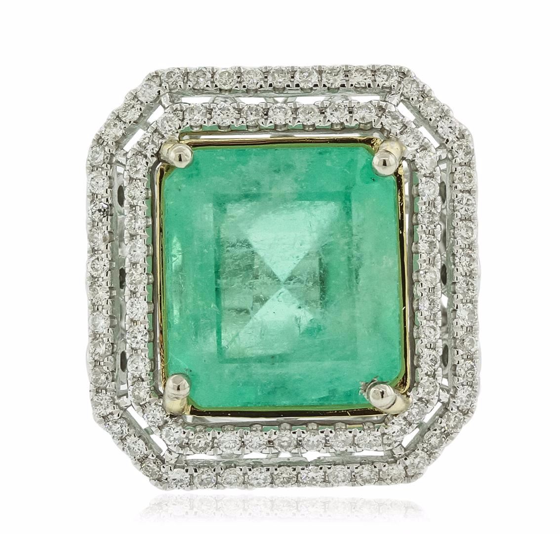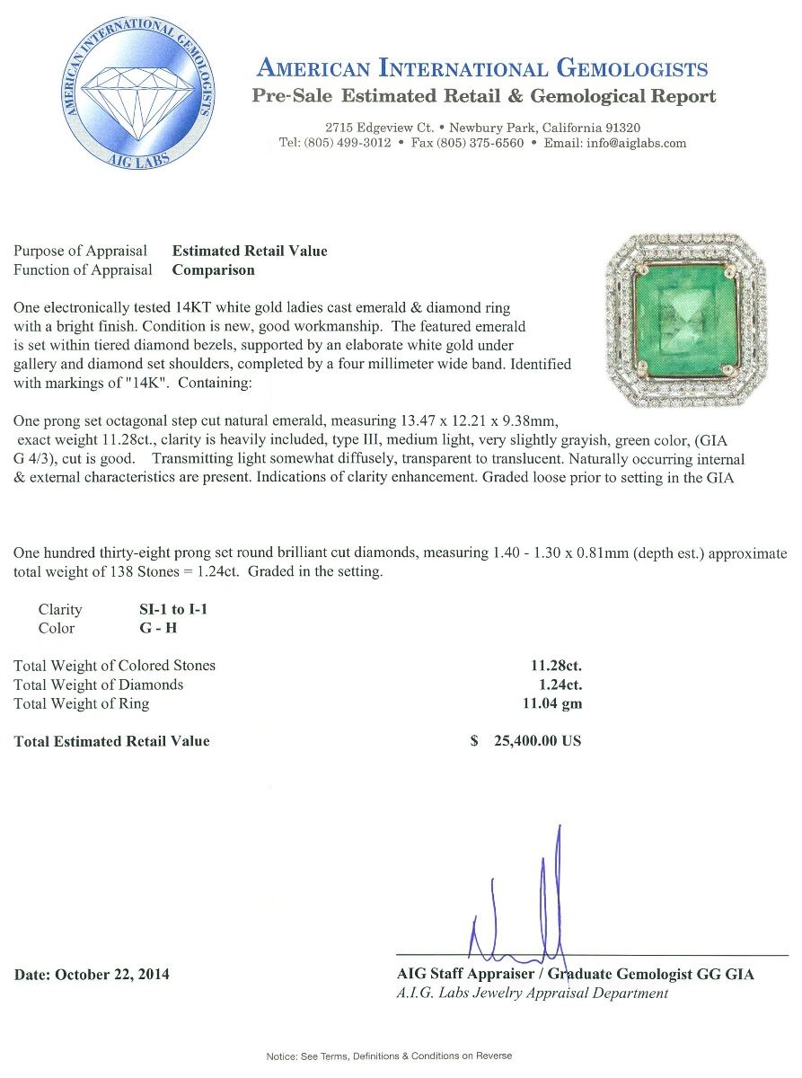 One electronically tested 14KT white gold ladies cast emerald & diamond ring with a bright finish. The featured emerald is set within tiered diamond bezels, supported by an elaborate white gold under gallery and diamond set shoulders, completed by a four millimeter wide band. Identified with markings of 14K. Condition is new, good workmanship. Containing: One prong set octagonal step cut natural emerald, measuring 13.47 x 12.21 x 9.38mm, exact weight 11.28ct., clarity is heavily included, type III, medium light, very slightly grayish, green color, (GIA G 4/3), cut is good. Transmitting light somewhat diffusely, transparent to translucent. Naturally occurring internal & external characteristics are present. Indications of clarity enhancement. Graded loose prior to setting in the GIA Laboratory, Report # 6167542584. The GIA Report is attached. One Hundred Thirty-Eight prong set round brilliant cut diamonds, measuring 1.40 - 1.30 x 0.81mm (depth est.) approximate total weight of 138 Stones = 1.24ct. Graded in the setting. Clarity: SI-1 to I-1. Color: G - H. Total Weight of Colored Stones 11.28ct. Total Weight of Diamonds 1.24ct. Total Weight of Ring 11.04 grams. AIG Appraised at $25,400.00.