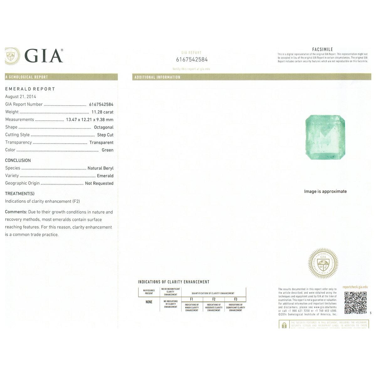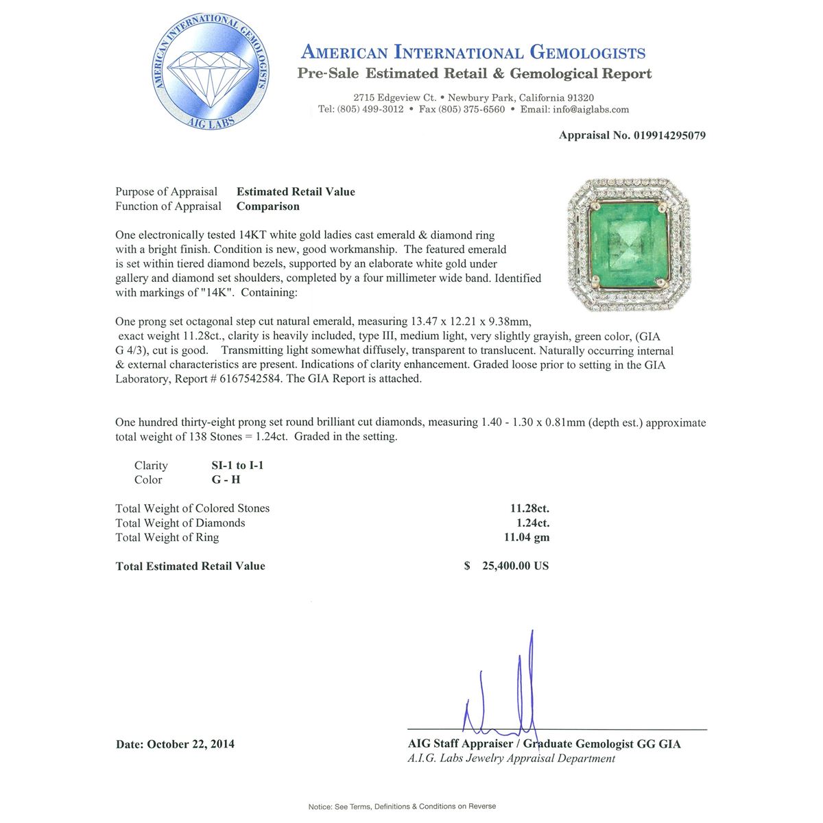 One electronically tested 14KT white gold ladies cast emerald & diamond ring with a bright finish. The featured emerald is set within tiered diamond bezels, supported by an elaborate white gold under gallery and diamond set shoulders, completed by a four millimeter wide band. Identified with markings of 14K. Condition is new, good workmanship. Containing: One prong set octagonal step cut natural emerald, measuring 13.47 x 12.21 x 9.38mm, exact weight 11.28ct., clarity is heavily included, type III, medium light, very slightly grayish, green color, (GIA G 4/3), cut is good. Transmitting light somewhat diffusely, transparent to translucent. Naturally occurring internal & external characteristics are present. Indications of clarity enhancement. Graded loose prior to setting in the GIA Laboratory, Report # 6167542584. The GIA Report is attached. One Hundred Thirty-Eight prong set round brilliant cut diamonds, measuring 1.40 - 1.30 x 0.81mm (depth est.) approximate total weight of 138 Stones = 1.24ct. Graded in the setting. Clarity: SI-1 to I-1. Color: G - H. Total Weight of Colored Stones 11.28ct. Total Weight of Diamonds 1.24ct. Total Weight of Ring 11.04 grams. AIG Appraised at $25,400.00.