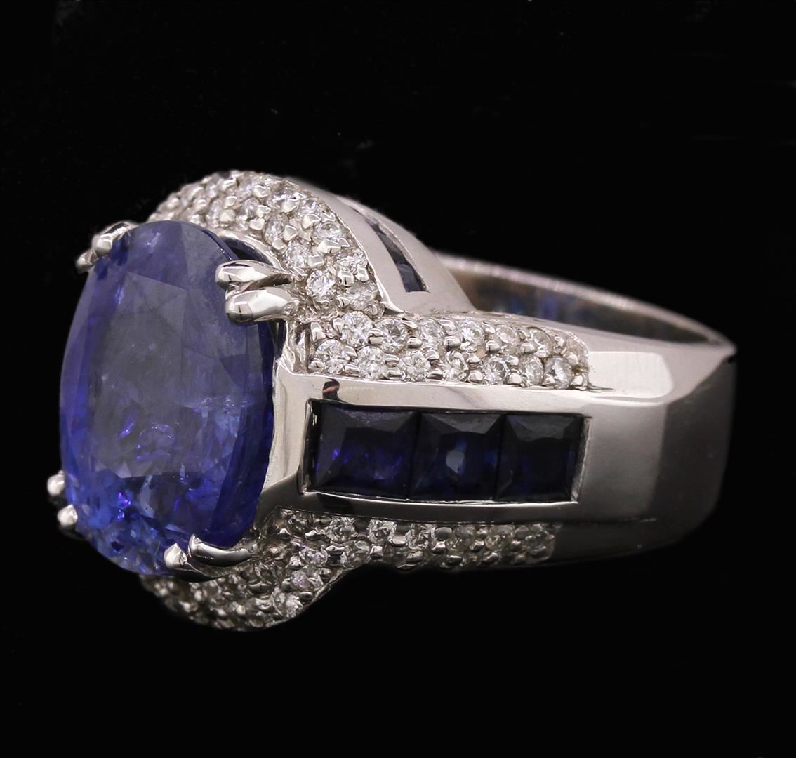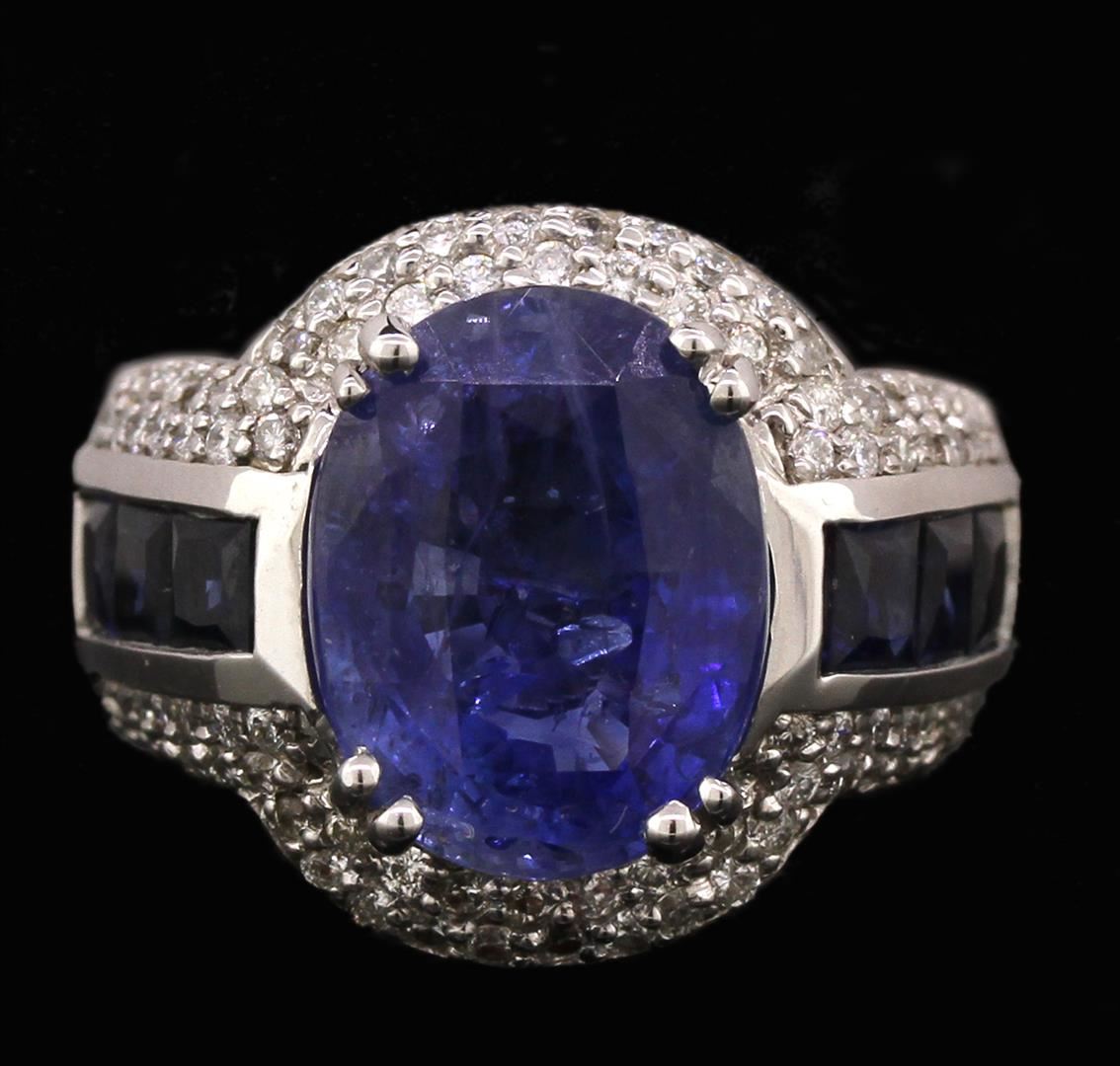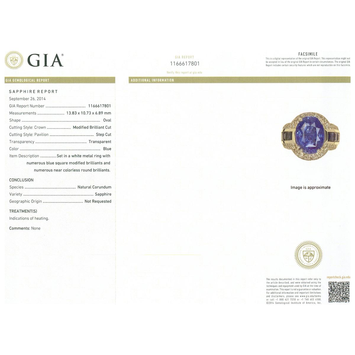 One electronically tested 14KT white gold ladies cast sapphire and diamond ring with a bright polish finish. The featured sapphire is set within a diamond bezel supported by sapphire accented under gallery and sapphire and diamond set shoulders, completed by a six millimeter wide band. Identified with markings of "14K". Condition is good. Containing: One prong set oval modified brilliant cut natural blue sapphire, measuring 13.83 x 10.73 x 6.89mm, 6% bulge factor, approximate weight of 8.81ct., clarity is heavily included, type II, medium dark, moderately strong, blue color, (GIA B 6/4), cut is good. Transmitting light with distortion, transparent. Naturally occurring internal & external characteristics are present. GIA Gemological Report attached. Indications of heating. Graded for identification in the GIA Laboratory, Report #1166617801.Six channel set square modified brilliant cut natural blue sapphires, measuring 3.50 x 3.40 x 2.24mm, 8% bulge factor, approximate total weight of 1.84ct., clarity is eye clean, type II, dark, very slightly grayish, blue color, (GIA B 7/3), cut is good. Transmitting light with no distortion, transparent. Measurements & the color grade are an average for the group. Graded in the setting. Eighteen channel set square modified brilliant cut natural blue sapphires, measuring 1.60 x 1.50 x 1.01mm, 6% bulge factor, approximate total weight of 0.64ct., clarity is eye clean, type II, dark, very slightly grayish, blue color, (GIA B 7/3), cut is good. Transmitting light with no distortion, transparent. Measurements & the color grade are an average for the group. Graded in the setting. Eighty-Eight prong set round brilliant cut diamonds, measuring 1.40 - 1.30 x 0.81mm (depth est.) approximate total weight of 88 Stones = 0.89ct. Graded in the setting. Clarity: SI-1 to SI-2. Color: H - J. Total Weight of Colored Stones 11.29ct. Total Weight of Diamonds 0.89ct. Total Weight of Ring 17.55 grams. AIG Appraised at $32,415.00.