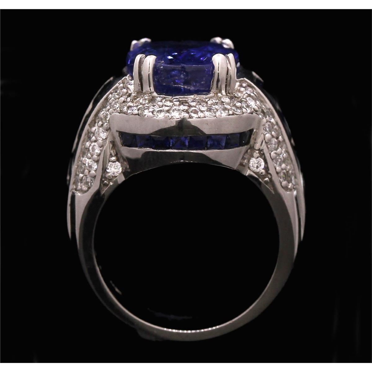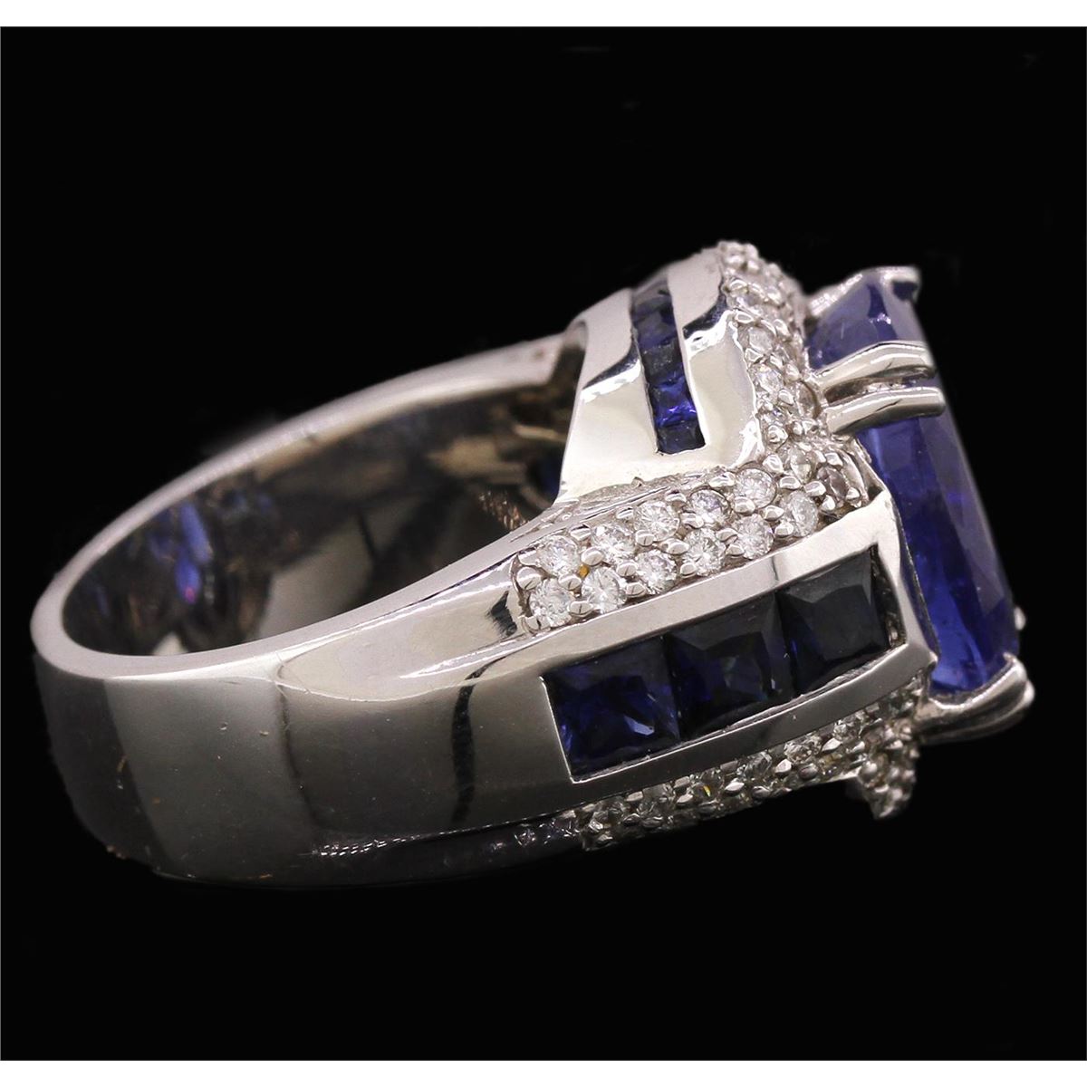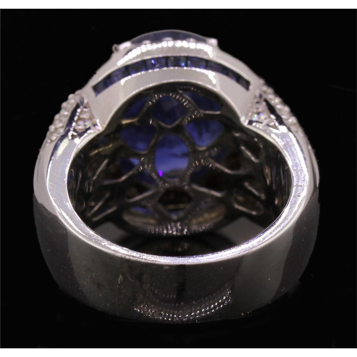 One electronically tested 14KT white gold ladies cast sapphire and diamond ring with a bright polish finish. The featured sapphire is set within a diamond bezel supported by sapphire accented under gallery and sapphire and diamond set shoulders, completed by a six millimeter wide band. Identified with markings of "14K". Condition is good. Containing: One prong set oval modified brilliant cut natural blue sapphire, measuring 13.83 x 10.73 x 6.89mm, 6% bulge factor, approximate weight of 8.81ct., clarity is heavily included, type II, medium dark, moderately strong, blue color, (GIA B 6/4), cut is good. Transmitting light with distortion, transparent. Naturally occurring internal & external characteristics are present. GIA Gemological Report attached. Indications of heating. Graded for identification in the GIA Laboratory, Report #1166617801.Six channel set square modified brilliant cut natural blue sapphires, measuring 3.50 x 3.40 x 2.24mm, 8% bulge factor, approximate total weight of 1.84ct., clarity is eye clean, type II, dark, very slightly grayish, blue color, (GIA B 7/3), cut is good. Transmitting light with no distortion, transparent. Measurements & the color grade are an average for the group. Graded in the setting. Eighteen channel set square modified brilliant cut natural blue sapphires, measuring 1.60 x 1.50 x 1.01mm, 6% bulge factor, approximate total weight of 0.64ct., clarity is eye clean, type II, dark, very slightly grayish, blue color, (GIA B 7/3), cut is good. Transmitting light with no distortion, transparent. Measurements & the color grade are an average for the group. Graded in the setting. Eighty-Eight prong set round brilliant cut diamonds, measuring 1.40 - 1.30 x 0.81mm (depth est.) approximate total weight of 88 Stones = 0.89ct. Graded in the setting. Clarity: SI-1 to SI-2. Color: H - J. Total Weight of Colored Stones 11.29ct. Total Weight of Diamonds 0.89ct. Total Weight of Ring 17.55 grams. AIG Appraised at $32,415.00.