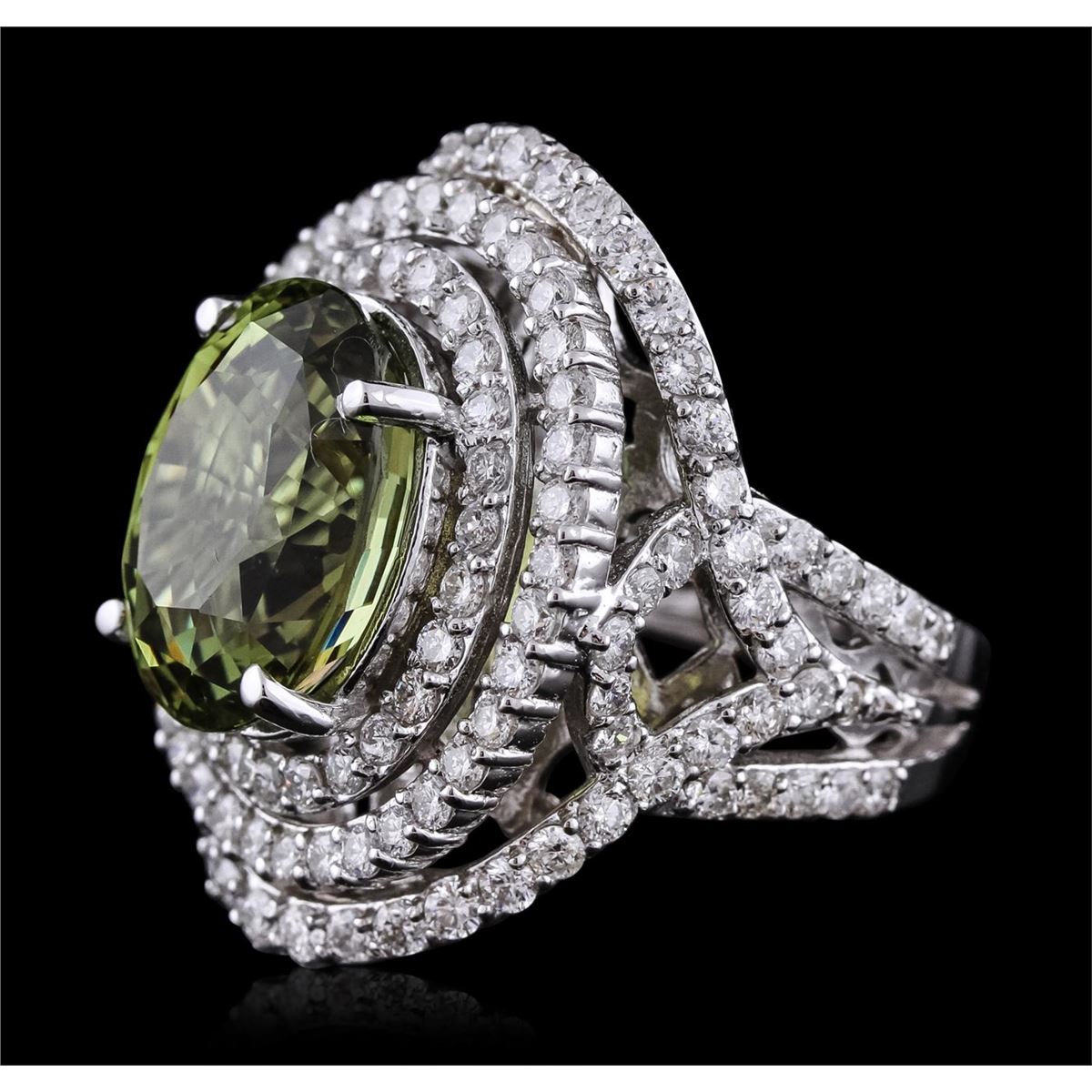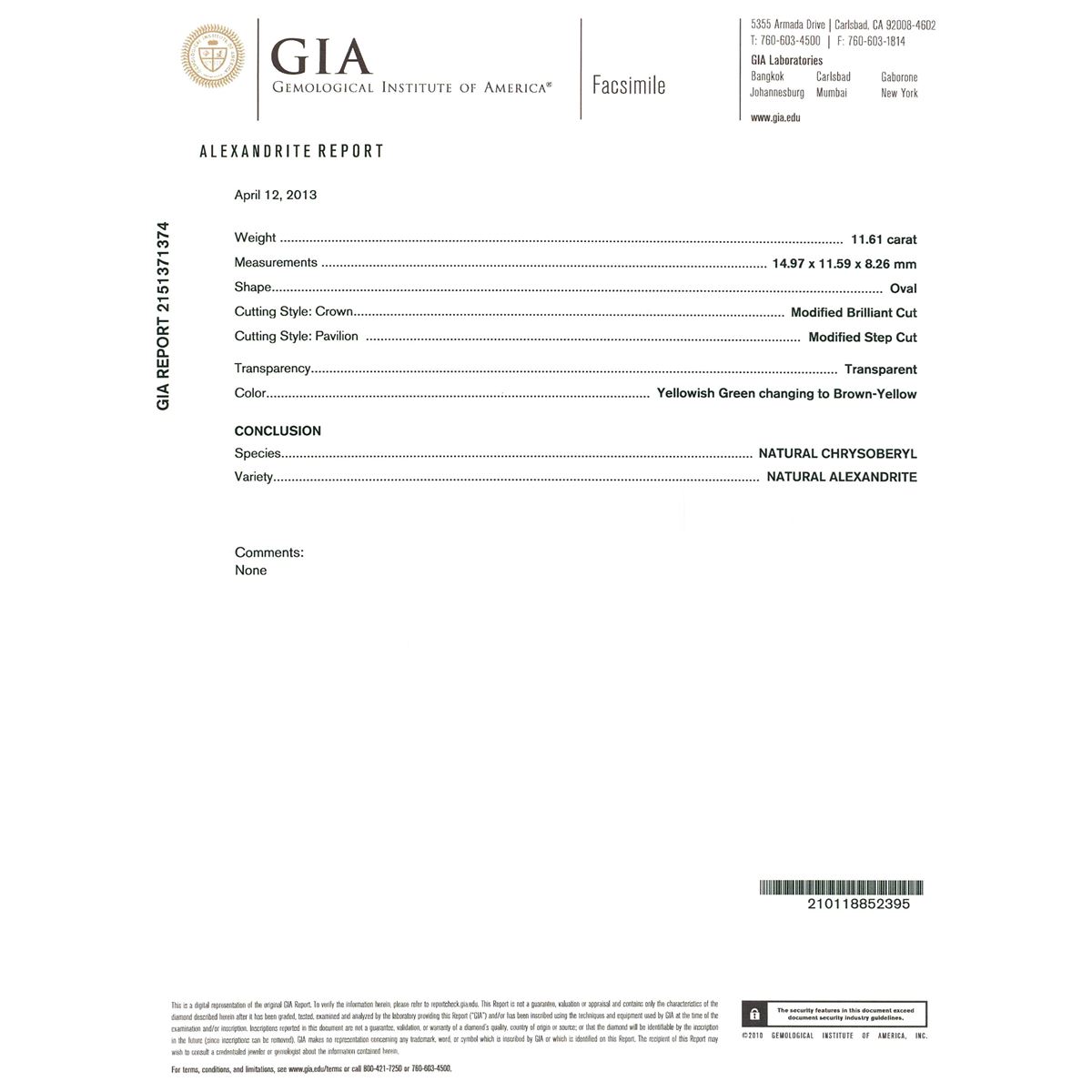 One electronically tested 14KT white gold ladies cast alexandrite and diamond ring with a bright polish finish. Condition is new, good workmanship. The featured alexandrite is set within multiple diamond bezels supported by diamond set three-way split shoulders, completed by a four millimeter wide band. Identified with markings of "K14". Containing: One prong set oval modified brilliant cut natural alexandrite, measuring 14.97 x 11.59 x 8.26mm, exact weight 11.61ct., type II Clarity is eye clean, medium dark, very slightly grayish, yellowish green color, (GIA yG 6/3) to medium dark, very slightly brownish, brown-yellow, (GIA BrY 6/3), cut is good. Transmitting light with no distortion, transparent. GIA Gemological Report attached. Graded loose prior to setting in the GIA Laboratory, Report #2151371374.Alexandrite was discovered in the 1830's near the Tokovaya River in the Ural Mountains of Siberian Russia. It later became the national gemstone of Russia. The name "alexandrite" became official in 1842.Alexandrite is a variety of chrysoberyl. It contains both beryllium and chromium. It is the chromium that accounts for the spectacular color change. The color change is the primary qualification for a chrysoberyl to be considered alexandrite. Alexandrite is strongly trichroic. Its color change results in a near-equal transmission of the blue-green and red portions of the spectrum, coupled with strong absorption in the yellow. Today Alexandrite is found in Brazil, India, Madagascar, Myanmar, Russia, Sri Lanka, Tanzania and Zimbabwe. One Hundred Thirty-Eight prong set round brilliant cut diamonds, measuring 1.90 - 1.80 x 1.11mm (depth est.) approximate total weight of 138 Stones = 3.28ct. Graded in the setting. Clarity: VS-2 to SI-2. Color: G - I. Total Weight of Colored Stones 11.61ct. Total Weight of Diamonds 3.28ct. Total Weight of Ring 17.05 grams. AIG Appraised at $81,330.00.