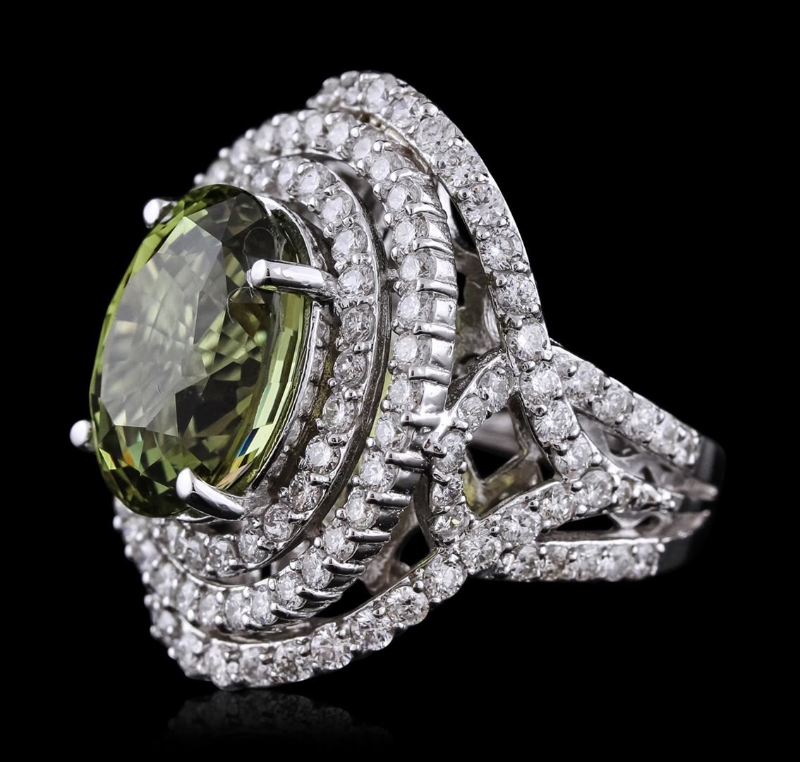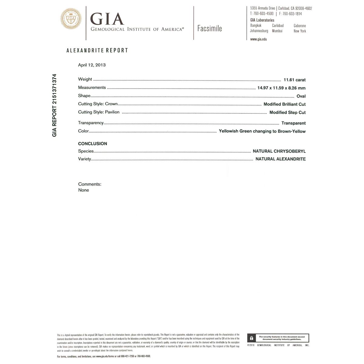 One electronically tested 14KT white gold ladies cast alexandrite and diamond ring with a bright polish finish. Condition is new, good workmanship. The featured alexandrite is set within multiple diamond bezels supported by diamond set three-way split shoulders, completed by a four millimeter wide band. Identified with markings of "K14". Containing: One prong set oval modified brilliant cut natural alexandrite, measuring 14.97 x 11.59 x 8.26mm, exact weight 11.61ct., type II Clarity is eye clean, medium dark, very slightly grayish, yellowish green color, (GIA yG 6/3) to medium dark, very slightly brownish, brown-yellow, (GIA BrY 6/3), cut is good. Transmitting light with no distortion, transparent. GIA Gemological Report attached. Graded loose prior to setting in the GIA Laboratory, Report #2151371374.Alexandrite was discovered in the 1830's near the Tokovaya River in the Ural Mountains of Siberian Russia. It later became the national gemstone of Russia. The name "alexandrite" became official in 1842.Alexandrite is a variety of chrysoberyl. It contains both beryllium and chromium. It is the chromium that accounts for the spectacular color change. The color change is the primary qualification for a chrysoberyl to be considered alexandrite. Alexandrite is strongly trichroic. Its color change results in a near-equal transmission of the blue-green and red portions of the spectrum, coupled with strong absorption in the yellow. Today Alexandrite is found in Brazil, India, Madagascar, Myanmar, Russia, Sri Lanka, Tanzania and Zimbabwe. One Hundred Thirty-Eight prong set round brilliant cut diamonds, measuring 1.90 - 1.80 x 1.11mm (depth est.) approximate total weight of 138 Stones = 3.28ct. Graded in the setting. Clarity: VS-2 to SI-2. Color: G - I. Total Weight of Colored Stones 11.61ct. Total Weight of Diamonds 3.28ct. Total Weight of Ring 17.05 grams. AIG Appraised at $81,330.00.