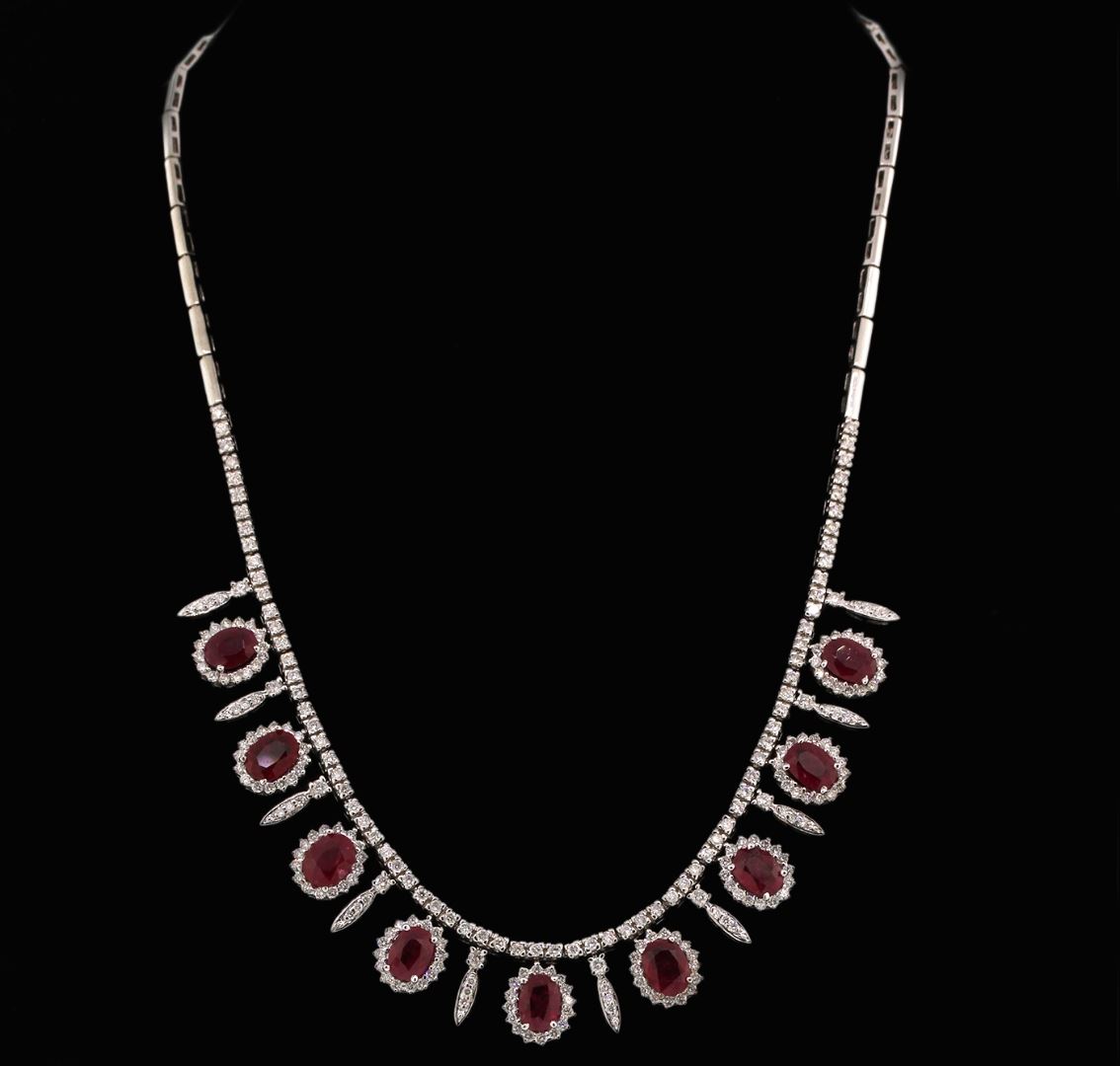 One electronically tested 14KT white gold ladies cast & assembled ruby and diamond necklace with a bright polish finish. Sixteen and three-quarter inch length necklace features a flexible ruby and diamond set fringe supported by a diamond ribbon transitioning into matching white gold links, terminating in a concealed clasp with safety. Identified with markings of "14K". Condition is good. Containing: Nine prong set oval mixed cut natural rubies, measuring 8.00 x 6.00 x 3.50mm, approximate total weight of 12.20ct., clarity is heavily included, type II, dark, very slightly brownish, red color, (GIA R 7/3), cut is good. Transmitting light somewhat diffusely, transparent to translucent. Naturally occurring internal & external characteristics are present. Measurements & the color grade are an average for the group. GIA Gemological Report attached. Indications of heating with moderate residues in fissures and minor residues in cavities. Graded for identification in the GIA Laboratory, Report #6167611912.Two Hundred Fifty-Nine prong set round brilliant cut diamonds, measuring 2.20 - 1.60 x 1.14mm (depth est.) approximate total weight of 259 Stones = 5.49ct. Graded in the setting. Clarity: SI-1 to I-1. Color: H - J. Total Weight of Colored Stones 12.20ct. Total Weight of Diamonds 5.49ct. Total Weight of Necklace 34.23 grams. AIG Appraised at $37,845.00.