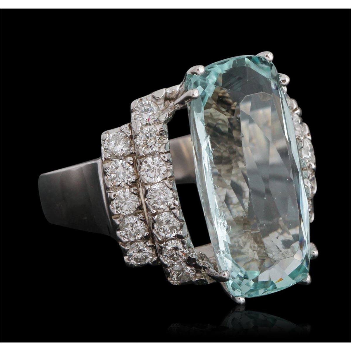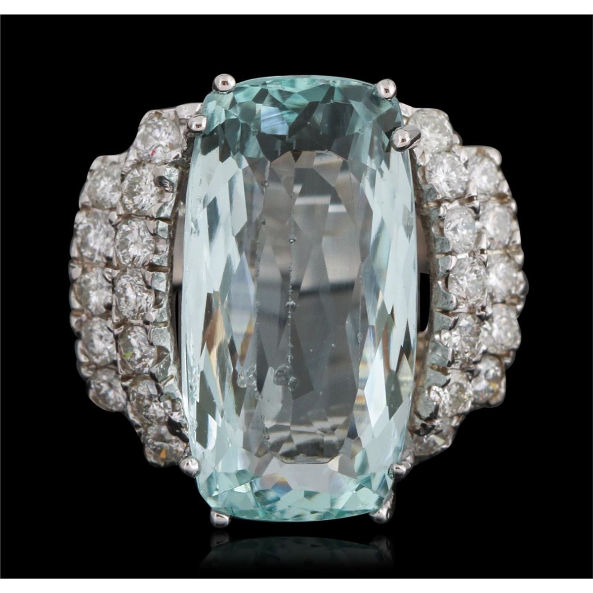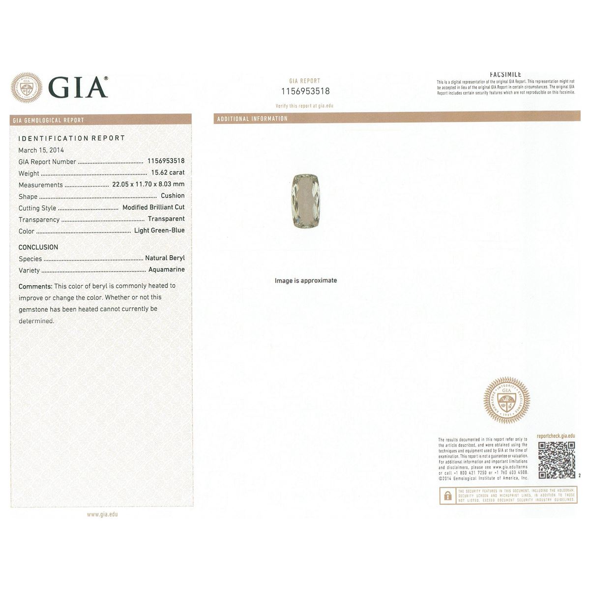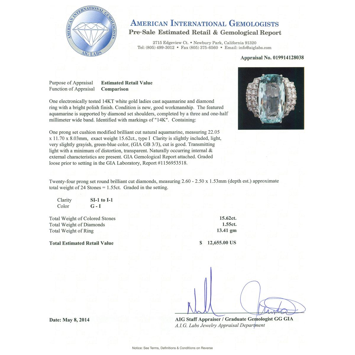 One electronically tested 14KT white gold ladies cast aquamarine and diamond ring with a bright polish finish. Condition is new, good workmanship. The featured aquamarine is supported by diamond set shoulders, completed by a three and one-half millimeter wide band. Identified with markings of "14K". Containing: One prong set cushion modified brilliant cut natural aquamarine, measuring 22.05 x 11.70 x 8.03mm, exact weight 15.62ct., type I Clarity is slightly included, light, very slightly grayish, green-blue color, (GIA GB 3/3), cut is good. Transmitting light with a minimum of distortion, transparent. Naturally occurring internal & external characteristics are present. GIA Gemological Report attached. Graded loose prior to setting in the GIA Laboratory, Report #1156953518.Twenty-Four prong set round brilliant cut diamonds, measuring 2.60 - 2.50 x 1.53mm (depth est.) approximate. Total Weight of 24 Stones = 1.55ct. Graded in the setting. Clarity: SI-1 to I-1. Color: G - I. Total Weight of Colored Stones 15.62ct. Total Weight of Diamonds 1.55ct. Total Weight of Ring 13.41gm. AIG Appraised at $12,655.00.