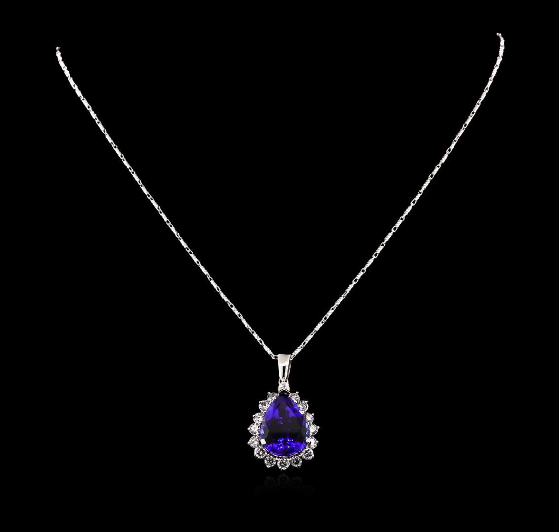 One electronically tested 14KT white gold ladies cast & assembled tanzanite and diamond pendant with chain. The pendant features a tanzanite set within a diamond bezel, completed by a white gold bail. The pendant is supported by an eighteen inch length 14KT white gold designer style chain, terminating in a lobster claw clasp. Bright polish finish. Identified with markings of "14K". Condition is new, good workmanship. Containing: One prong set pear modified brilliant cut natural tanzanite, measuring 17.99 x 13.94 x 9.81mm, exact weight 16.01ct., clarity is eye clean, type I, dark, moderately strong, violet color, (GIA V 7/4), cut is good. Transmitting light with no distortion, transparent. GIA Gemological Report attached. Graded loose prior to setting in the GIA Laboratory, Report #6157951668.Tanzanite is a very rare gemstone that is only found in the country of Tanzania. Originally discovered in 1967. Tiffany & Company, named the stone Tanzanite. It is found in the Usumburu Mountains that border the Umba Valley of northern Tanzania. Tanzanite occurs in gray, brown, violet, blue, reddish-purple, & green. The gem is interesting because of its exceptional pleochroism. Rotated in different directions a tanzanite will exhibit multiple changes of color. Tanzanite has a low tolerance to ultrasonic cleaning, and should not be cleaned using this method. Sixteen prong set round brilliant cut diamonds, measuring 3.40 - 3.20 x 1.98mm (depth est.) approximate total weight of 16 Stones = 2.15ct. Graded in the setting. Clarity: SI-2 to I-1. Color: H - J. Total Weight of Colored Stones 16.01ct. Total Weight of Diamonds 2.15ct. Total Weight of Pendant With Chain 16.05 grams. AIG Appraised at $43,070.00.