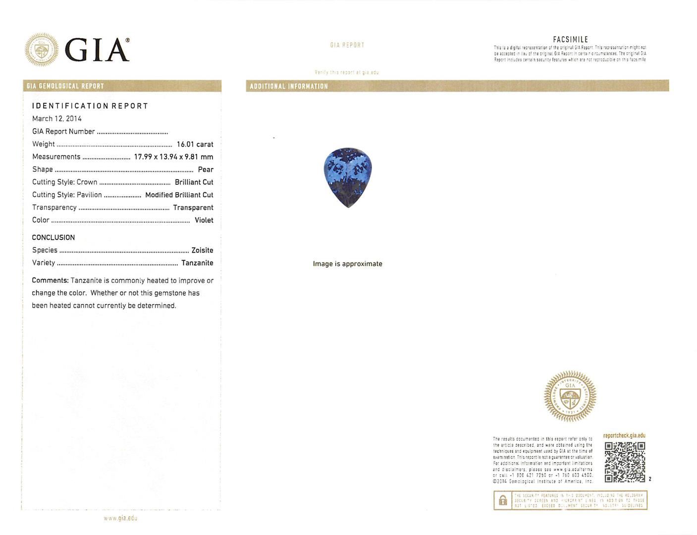 One electronically tested 14KT white gold ladies cast & assembled tanzanite and diamond pendant with chain. The pendant features a tanzanite set within a diamond bezel, completed by a white gold bail. The pendant is supported by an eighteen inch length 14KT white gold designer style chain, terminating in a lobster claw clasp. Bright polish finish. Identified with markings of "14K". Condition is new, good workmanship. Containing: One prong set pear modified brilliant cut natural tanzanite, measuring 17.99 x 13.94 x 9.81mm, exact weight 16.01ct., clarity is eye clean, type I, dark, moderately strong, violet color, (GIA V 7/4), cut is good. Transmitting light with no distortion, transparent. GIA Gemological Report attached. Graded loose prior to setting in the GIA Laboratory, Report #6157951668.Tanzanite is a very rare gemstone that is only found in the country of Tanzania. Originally discovered in 1967. Tiffany & Company, named the stone Tanzanite. It is found in the Usumburu Mountains that border the Umba Valley of northern Tanzania. Tanzanite occurs in gray, brown, violet, blue, reddish-purple, & green. The gem is interesting because of its exceptional pleochroism. Rotated in different directions a tanzanite will exhibit multiple changes of color. Tanzanite has a low tolerance to ultrasonic cleaning, and should not be cleaned using this method. Sixteen prong set round brilliant cut diamonds, measuring 3.40 - 3.20 x 1.98mm (depth est.) approximate total weight of 16 Stones = 2.15ct. Graded in the setting. Clarity: SI-2 to I-1. Color: H - J. Total Weight of Colored Stones 16.01ct. Total Weight of Diamonds 2.15ct. Total Weight of Pendant With Chain 16.05 grams. AIG Appraised at $43,070.00.