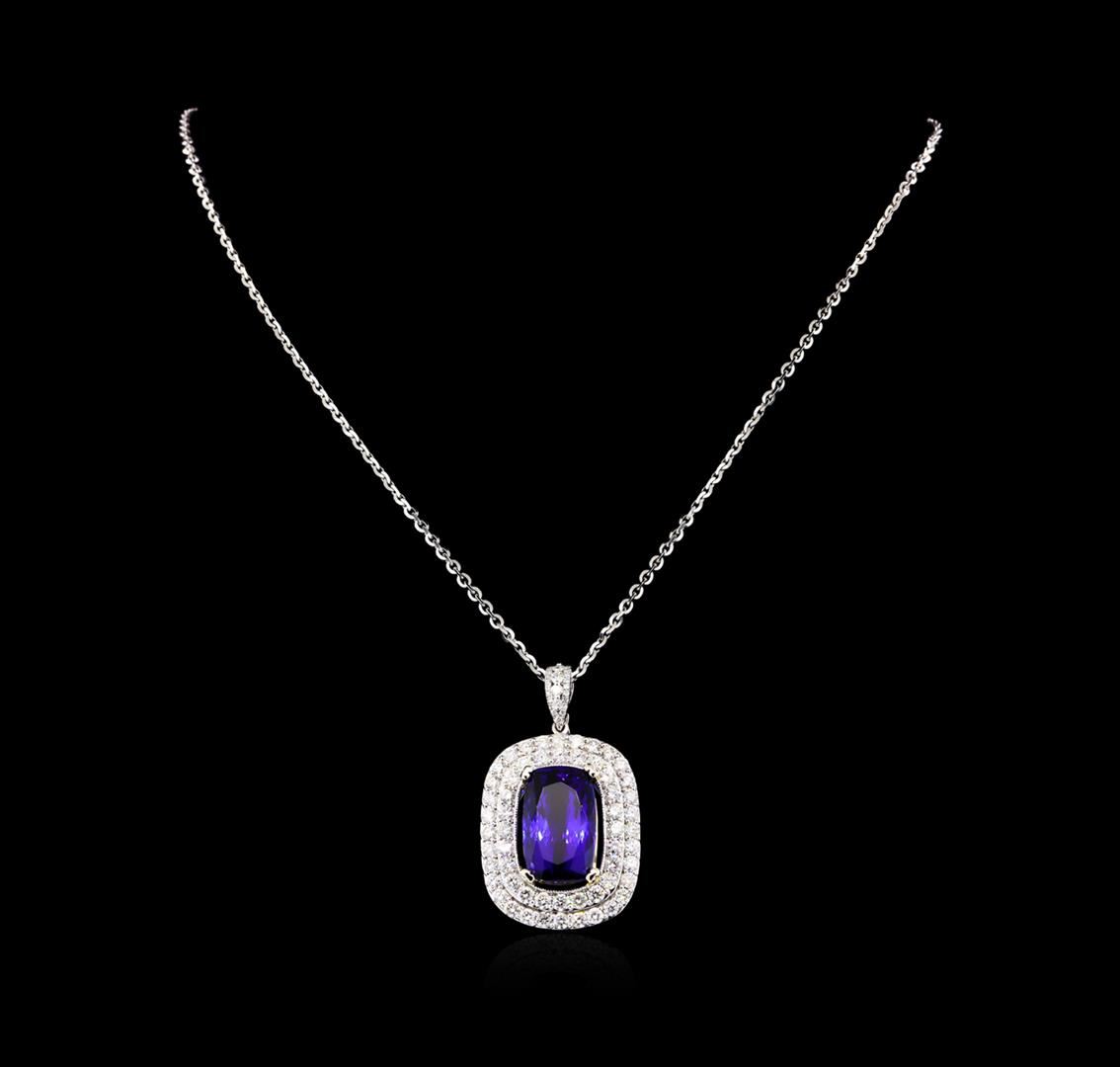 One electronically tested 14KT white gold cast & assembled tanzanite and diamond pendant/enhancer with chain. The pendant/enhancer features a tanzanite set within two tiered diamond bezels, completed by a diamond set bail. The pendant/enhancer is supported by an eighteen inch length 14KT white gold designer style chain, terminating in a lobster claw clasp. Bright polish finish with milgrain detailing. Identified with markings of 14K. Condition is new, good workmanship. Containing: One prong set cushion modified brilliant cut natural tanzanite, measuring 18.81 x 11.73 x 8.27mm, exact weight 16.65ct., clarity is eye clean, type I, dark, moderately strong, violet color, (GIA V 7/4), cut is good. Transmitting light with no distortion, transparent. GIA Gemological Report attached. Graded loose prior to setting in the GIA Laboratory, Report #2161542860.Tanzanite is a very rare gemstone that is only found in the country of Tanzania. Originally discovered in 1967. Tiffany & Company, named the stone Tanzanite. It is found in the Usumburu Mountains that border the Umba Valley of northern Tanzania. Tanzanite occurs in gray, brown, violet, blue, reddish-purple, & green. The gem is interesting because of its exceptional pleochroism. Rotated in different directions a tanzanite will exhibit multiple changes of color. Tanzanite has a low tolerance to ultrasonic cleaning, and should not be cleaned using this method. Fifty-Six prong set round brilliant cut diamonds, measuring 2.90 - 2.70 x 1.68mm (depth est.) approximate total weight of 56 Stones = 4.60ct. Graded in the setting. Clarity: SI-1 to I-1. Color: G - I Twenty-Five prong set round brilliant cut diamonds, measuring 2.00 - 1.00 x 0.90mm (depth est.) approximate total weight of 25 Stones = 0.20ct. Graded in the setting. Clarity: SI-2 to I-1. Color: G - I. Total Weight of Colored Stones 16.65ct. Total Weight of Diamonds 4.80ct. Total Weight of Pendant/Enhancer With Chain 19.84 grams. AIG Appraised at $55,445.00.