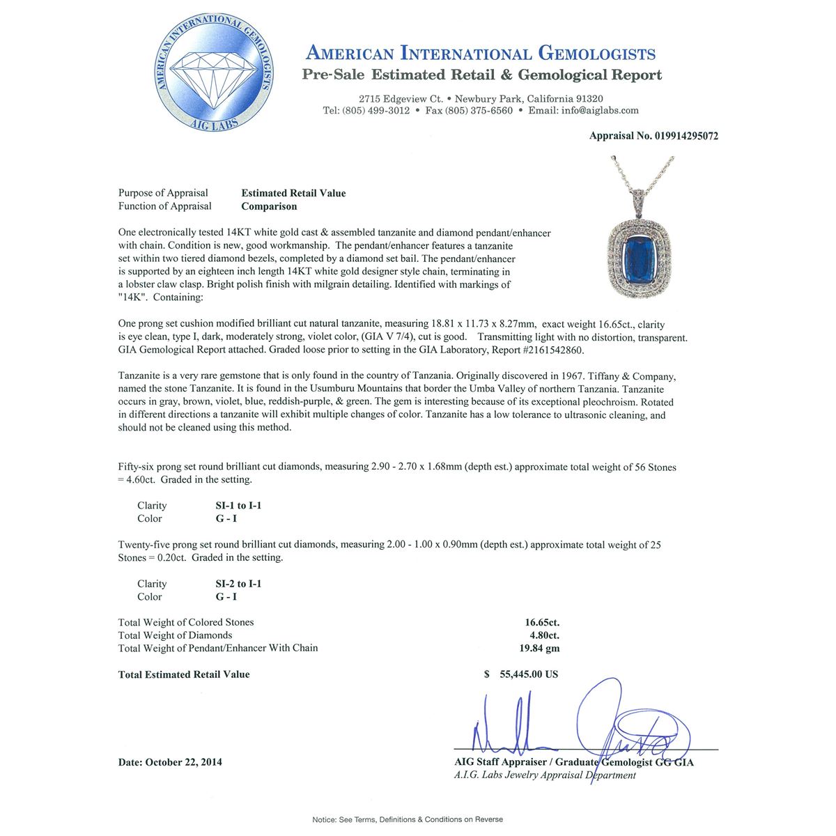 One electronically tested 14KT white gold cast & assembled tanzanite and diamond pendant/enhancer with chain. The pendant/enhancer features a tanzanite set within two tiered diamond bezels, completed by a diamond set bail. The pendant/enhancer is supported by an eighteen inch length 14KT white gold designer style chain, terminating in a lobster claw clasp. Bright polish finish with milgrain detailing. Identified with markings of 14K. Condition is new, good workmanship. Containing: One prong set cushion modified brilliant cut natural tanzanite, measuring 18.81 x 11.73 x 8.27mm, exact weight 16.65ct., clarity is eye clean, type I, dark, moderately strong, violet color, (GIA V 7/4), cut is good. Transmitting light with no distortion, transparent. GIA Gemological Report attached. Graded loose prior to setting in the GIA Laboratory, Report #2161542860.Tanzanite is a very rare gemstone that is only found in the country of Tanzania. Originally discovered in 1967. Tiffany & Company, named the stone Tanzanite. It is found in the Usumburu Mountains that border the Umba Valley of northern Tanzania. Tanzanite occurs in gray, brown, violet, blue, reddish-purple, & green. The gem is interesting because of its exceptional pleochroism. Rotated in different directions a tanzanite will exhibit multiple changes of color. Tanzanite has a low tolerance to ultrasonic cleaning, and should not be cleaned using this method. Fifty-Six prong set round brilliant cut diamonds, measuring 2.90 - 2.70 x 1.68mm (depth est.) approximate total weight of 56 Stones = 4.60ct. Graded in the setting. Clarity: SI-1 to I-1. Color: G - I Twenty-Five prong set round brilliant cut diamonds, measuring 2.00 - 1.00 x 0.90mm (depth est.) approximate total weight of 25 Stones = 0.20ct. Graded in the setting. Clarity: SI-2 to I-1. Color: G - I. Total Weight of Colored Stones 16.65ct. Total Weight of Diamonds 4.80ct. Total Weight of Pendant/Enhancer With Chain 19.84 grams. AIG Appraised at $55,445.00.