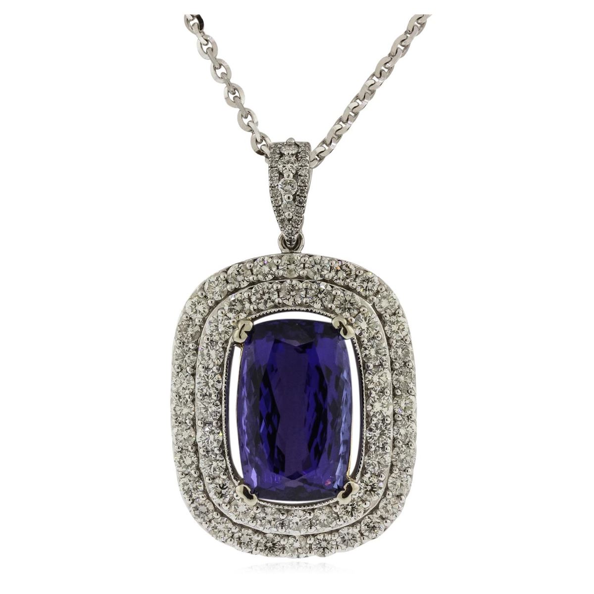 One electronically tested 14KT white gold cast & assembled tanzanite and diamond pendant/enhancer with chain. The pendant/enhancer features a tanzanite set within two tiered diamond bezels, completed by a diamond set bail. The pendant/enhancer is supported by an eighteen inch length 14KT white gold designer style chain, terminating in a lobster claw clasp. Bright polish finish with milgrain detailing. Identified with markings of 14K. Condition is new, good workmanship. Containing: One prong set cushion modified brilliant cut natural tanzanite, measuring 18.81 x 11.73 x 8.27mm, exact weight 16.65ct., clarity is eye clean, type I, dark, moderately strong, violet color, (GIA V 7/4), cut is good. Transmitting light with no distortion, transparent. GIA Gemological Report attached. Graded loose prior to setting in the GIA Laboratory, Report #2161542860.Tanzanite is a very rare gemstone that is only found in the country of Tanzania. Originally discovered in 1967. Tiffany & Company, named the stone Tanzanite. It is found in the Usumburu Mountains that border the Umba Valley of northern Tanzania. Tanzanite occurs in gray, brown, violet, blue, reddish-purple, & green. The gem is interesting because of its exceptional pleochroism. Rotated in different directions a tanzanite will exhibit multiple changes of color. Tanzanite has a low tolerance to ultrasonic cleaning, and should not be cleaned using this method. Fifty-Six prong set round brilliant cut diamonds, measuring 2.90 - 2.70 x 1.68mm (depth est.) approximate total weight of 56 Stones = 4.60ct. Graded in the setting. Clarity: SI-1 to I-1. Color: G - I Twenty-Five prong set round brilliant cut diamonds, measuring 2.00 - 1.00 x 0.90mm (depth est.) approximate total weight of 25 Stones = 0.20ct. Graded in the setting. Clarity: SI-2 to I-1. Color: G - I. Total Weight of Colored Stones 16.65ct. Total Weight of Diamonds 4.80ct. Total Weight of Pendant/Enhancer With Chain 19.84 grams. AIG Appraised at $55,445.00.