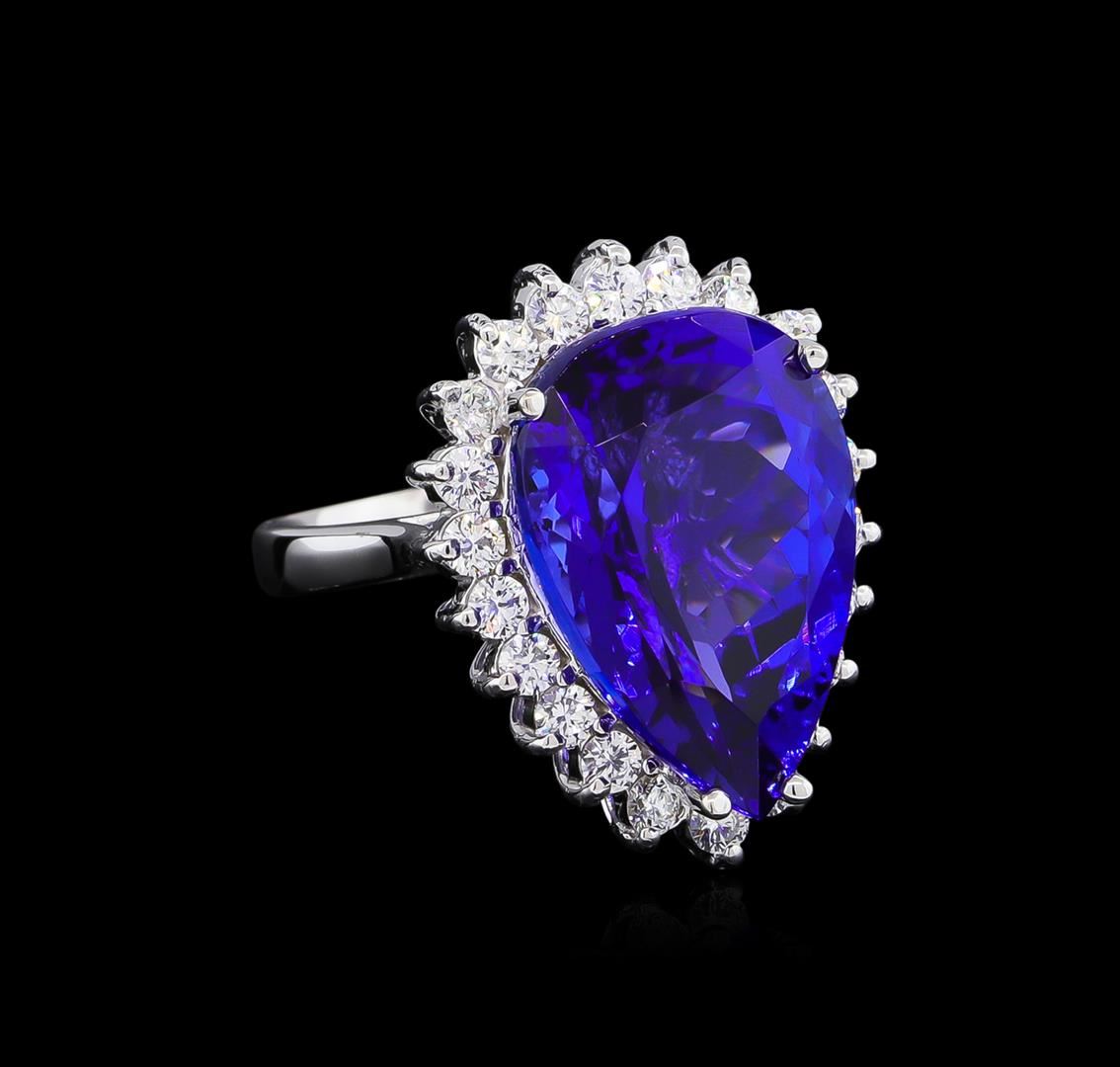 One electronically tested 14KT white gold ladies cast tanzanite and diamond ring with a bright polish finish. The featured tanzanite is set within a diamond bezel, completed by a three millimeter wide band. Identified with markings of "14K". Condition is new, good workmanship. Containing: One prong set pear modified brilliant cut natural tanzanite, measuring 19.11 x 13.52 x 10.08mm, exact weight 16.98ct., clarity is eye clean, type I, dark, moderately strong, violetish blue color, (GIA vB 7/4), cut is good. Transmitting light with no distortion, transparent. GIA Gemological Report attached. Graded loose prior to setting in the GIA Laboratory, Report #1156962476.Tanzanite is a very rare gemstone that is only found in the country of Tanzania. Originally discovered in 1967. Tiffany & Company, named the stone Tanzanite. It is found in the Usumburu Mountains that border the Umba Valley of northern Tanzania. Tanzanite occurs in gray, brown, violet, blue, reddish-purple, & green. The gem is interesting because of its exceptional pleochroism. Rotated in different directions a tanzanite will exhibit multiple changes of color. Tanzanite has a low tolerance to ultrasonic cleaning, and should not be cleaned using this method. Twenty-Two prong set round brilliant cut diamonds, measuring 2.40 - 2.30 x 1.41mm (depth est.) approximate total weight of 22 Stones = 1.15ct. Graded in the setting. Clarity: SI-1 to SI-2. Color: G - I. Total Weight of Colored Stones 16.98ct. Total Weight of Diamonds 1.15ct. Total Weight of Ring 10.48 grams. AIG Appraised at $48,220.00.